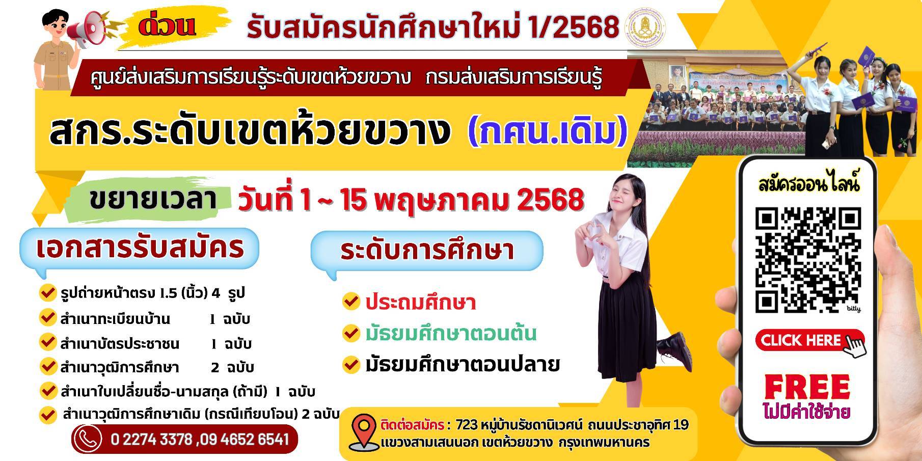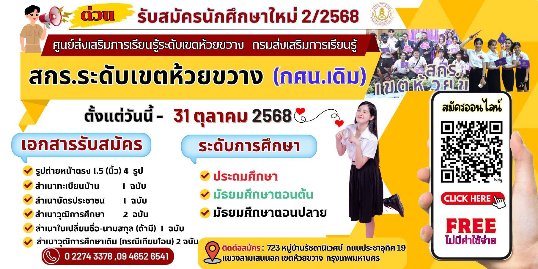 สกร.ระดับเขตห้วยขวาง (เดิม กศน.เขตห้วยขวาง ) เปิดรับสมัครนักศึกษาใหม่ ภาคเรียนที่ 2 ปีการศึกษา 2568 ระหว่างวันที่ 1-31 ตุลาคม 2568 นะคะ