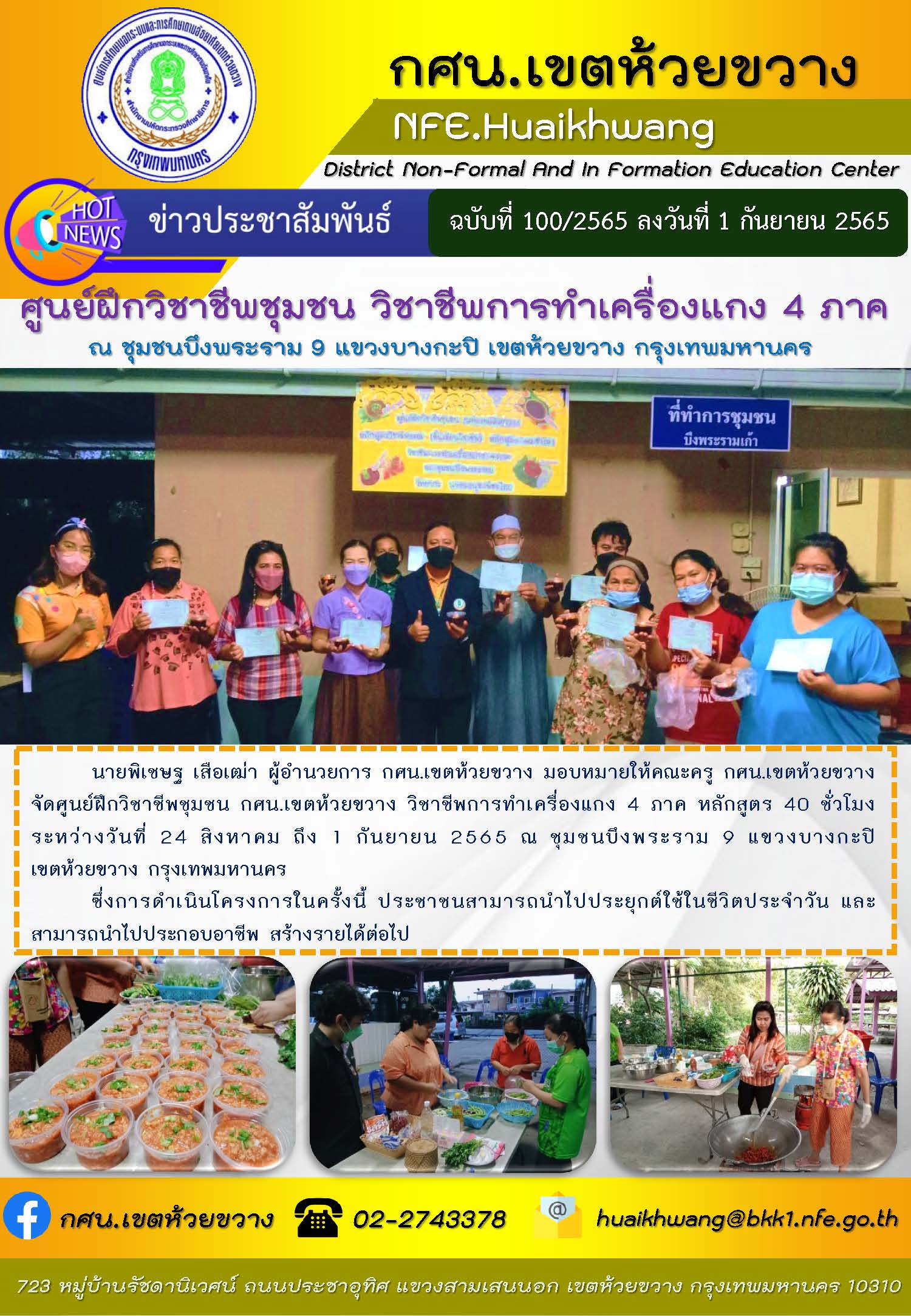 นายพิเชษฐ เสือเฒ่า ผู้อำนวยการ กศน.เขตห้วยขวาง มอบหมายให้คณะครู กศน.เขตห้วยขวาง จัดศูนย์ฝึกวิชาชีพชุมชน กศน.เขตห้วยขวาง วิชาชีพการทำเครื่องแกง 4 ภาค หลักสูตร 40 ชั่วโมง ระหว่างวันที่ 24 สิงหาคม ถึง 1 กันยายน 2565 ณ ชุมชนบึงพระราม 9 แขวงบางกะปิ เขตห้วยขวาง กรุงเทพมหานคร