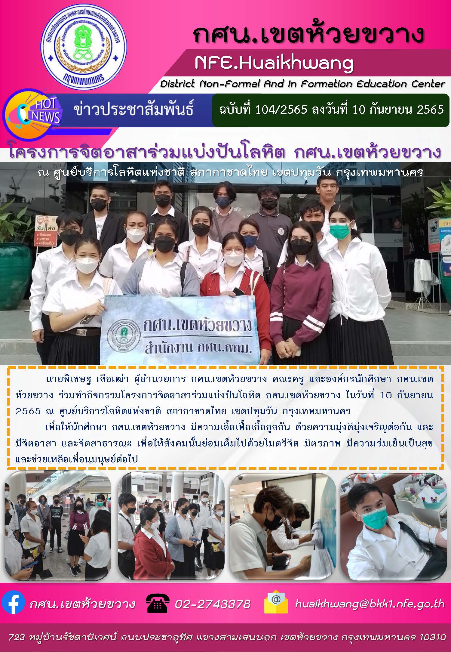 นายพิเชษฐ เสือเฒ่า ผู้อำนวยการ กศน.เขตห้วยขวาง คณะครู และองค์กรนักศึกษา กศน.เขตห้วยขวาง ร่วมทำกิจกรรมโครงการ จิตอาสาร่วมแบ่งปันโลหิต กศน.เขตห้วยขวาง ในวันที่ 10 กันยายน 2565 ณ ศูนย์บริการโลหิตแห่งชาติ สภากาชาดไทย เขตปทุมวัน กรุงเทพมหานคร