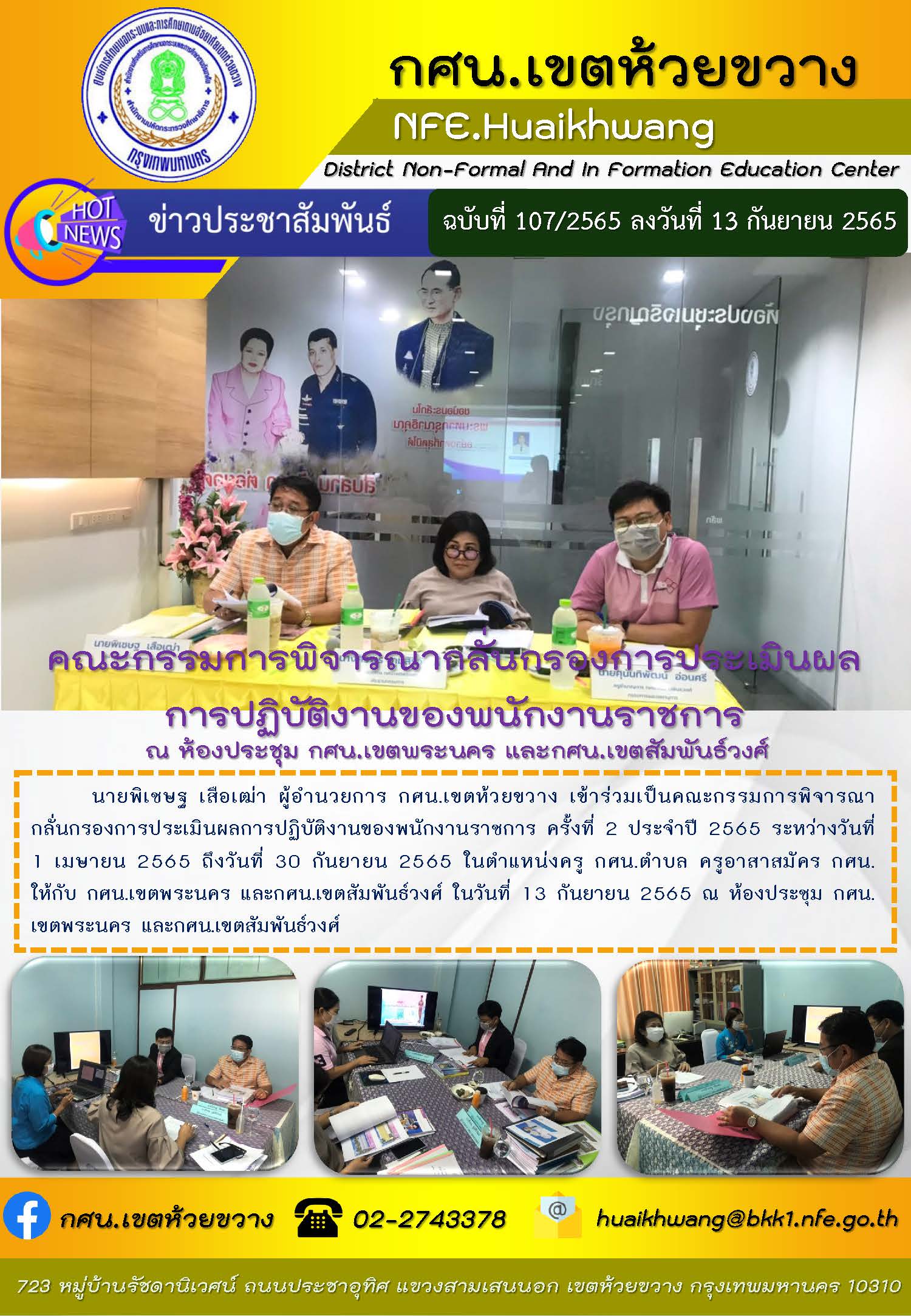 นายพิเชษฐ เสือเฒ่า ผู้อำนวยการ กศน.เขตห้วยขวาง เข้าร่วมเป็นคณะกรรมการพิจารณากลั่นกรองการประเมินผลการปฏิบัติงานของพนักงานราชการ ครั้งที่ 2 ประจำปี 2565 ระหว่างวันที่ 1 เมษายน 2565 ถึงวันที่ 30 กันยายน 2565 ในตำแหน่งครู กศน.ตำบล ครูอาสาสมัคร กศน. ให้กับ กศน.เขตพระนคร และกศน.เขตสัมพันธ์วงศ์ ในวันที่ 13 กันยายน 2565 ณ ห้องประชุม กศน.เขตพระนคร และกศน.เขตสัมพันธ์วงศ์