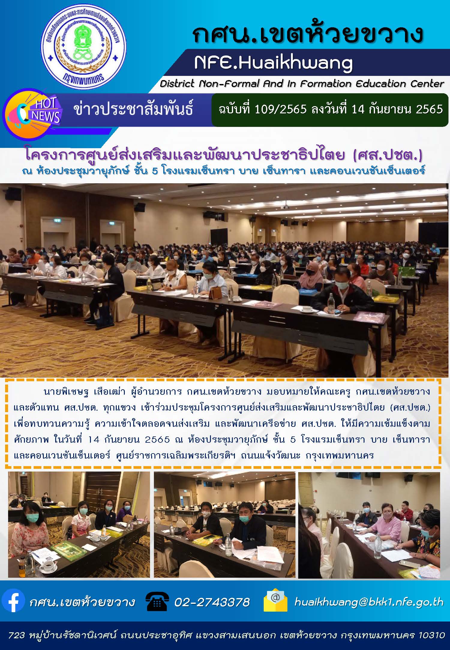 นายพิเชษฐ เสือเฒ่า ผู้อำนวยการ กศน.เขตห้วยขวาง มอบหมายให้คณะครู กศน.เขตห้วยขวาง และตัวแทน ศส.ปชต. ทุกแขวง เข้าร่วมประชุมโครงการศูนย์ส่งเสริมและพัฒนาประชาธิปไตย (ศส.ปชต.) เพื่อทบทวนความรู้ ความเข้าใจตลอดจนส่งเสริม และพัฒนาเครือข่าย ศส.ปชต. ให้มีความเข้มแข็งตามศักยภาพ ในวันที่ 14 กันยายน 2565 ณ ห้องประชุมวายุภักษ์ ชั้น 5 โรงแรมเซ็นทรา บาย เซ็นทารา และคอนเวนชันเซ็นเตอร์ ศูนย์ราชการเฉลิมพระเกียรติฯ ถนนแจ้งวัฒนะ กรุงเทพมหานคร