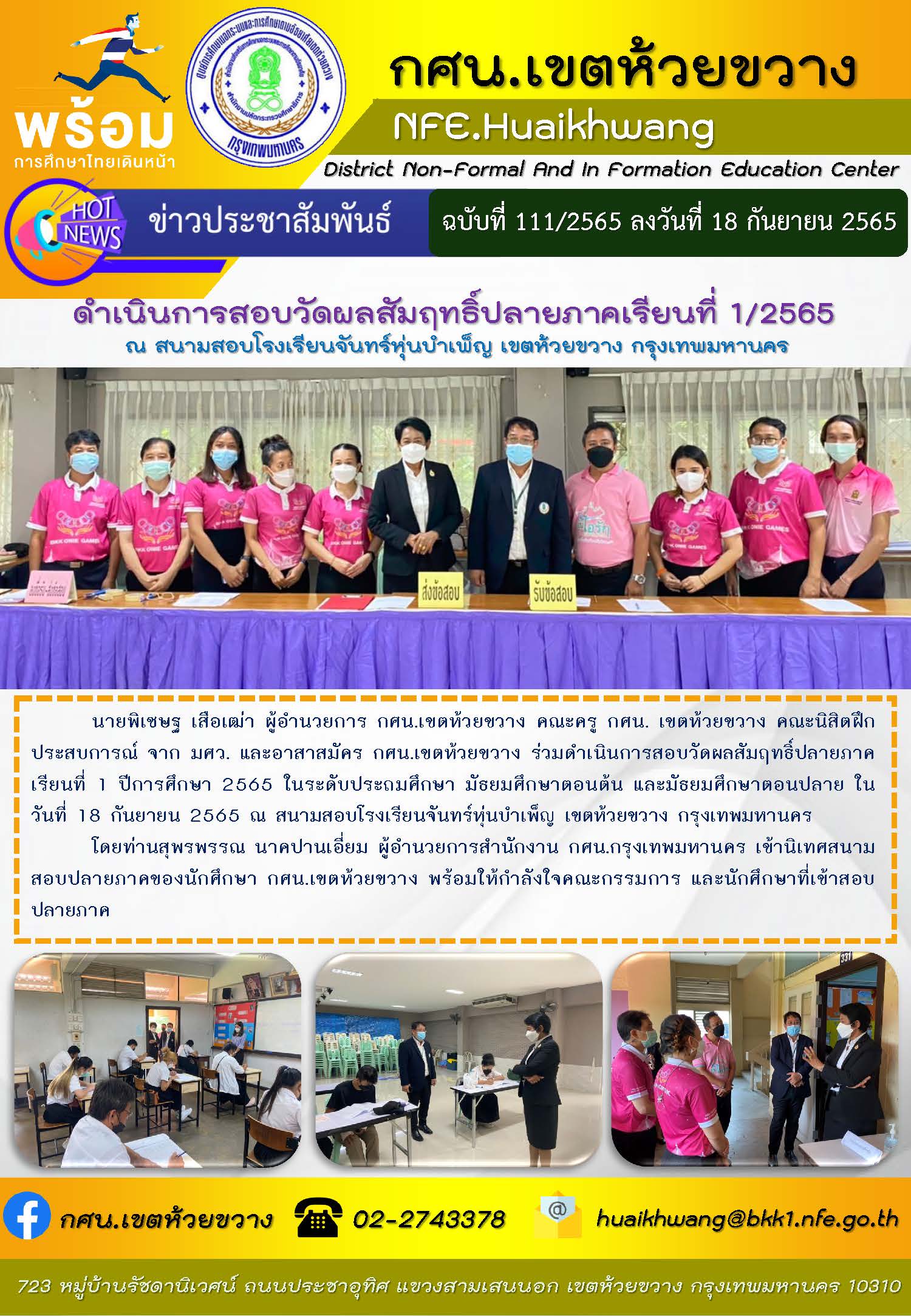 นายพิเชษฐ เสือเฒ่า ผู้อำนวยการ กศน.เขตห้วยขวาง คณะครู กศน. เขตห้วยขวาง คณะนิสิตฝึกประสบการณ์ จาก มศว. และอาสาสมัคร กศน.เขตห้วยขวาง ร่วมดำเนินการสอบวัดผลสัมฤทธิ์ปลายภาคเรียนที่ 1 ปีการศึกษา 2565 ในระดับประถมศึกษา มัธยมศึกษาตอนต้น และมัธยมศึกษาตอนปลาย ในวันที่ 18 กันยายน 2565 ณ สนามสอบโรงเรียนจันทร์หุ่นบำเพ็ญ เขตห้วยขวาง กรุงเทพมหานคร