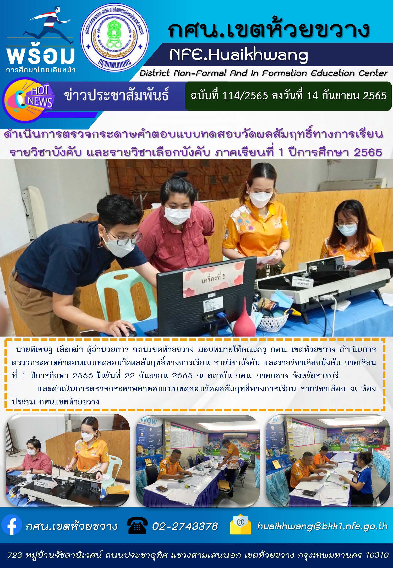 นายพิเชษฐ เสือเฒ่า ผู้อำนวยการ กศน.เขตห้วยขวาง มอบหมายให้คณะครู กศน. เขตห้วยขวาง ดำเนินการตรวจกระดาษคำตอบแบบทดสอบวัดผลสัมฤทธิ์ทางการเรียน รายวิชาบังคับ และรายวิชาเลือกบังคับ ภาคเรียนที่ 1 ปีการศึกษา 2565 ในวันที่ 22 กันยายน 2565 ณ สถาบัน กศน. ภาคกลาง จังหวัดราชบุรี