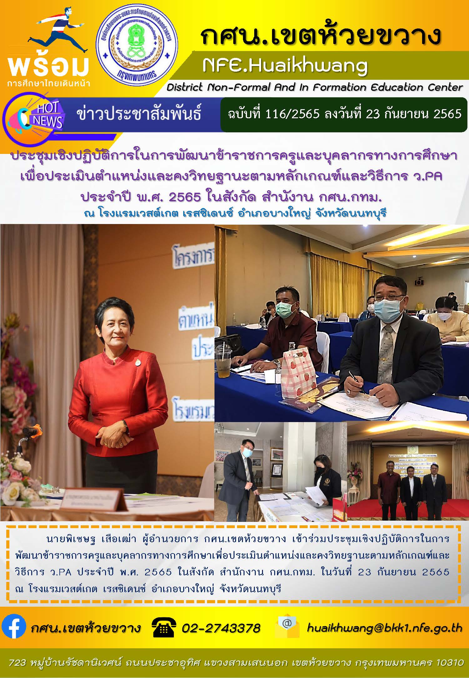 นายพิเชษฐ เสือเฒ่า ผู้อำนวยการ กศน.เขตห้วยขวาง เข้าร่วมประชุมเชิงปฏิบัติการในการพัฒนาข้าราชการครูและบุคลากรทางการศึกษาเพื่อประเมินตำแหน่งและคงวิทยฐานะตามหลักเกณฑ์และวิธีการ ว.PA ประจำปี พ.ศ. 2565 ในสังกัด สำนักงาน กศน.กทม. ในวันที่ 23 กันยายน 2565 ณ โรงแรมเวสต์เกต เรสซิเดนซ์ อำเภอบางใหญ่ จังหวัดนนทบุรี
