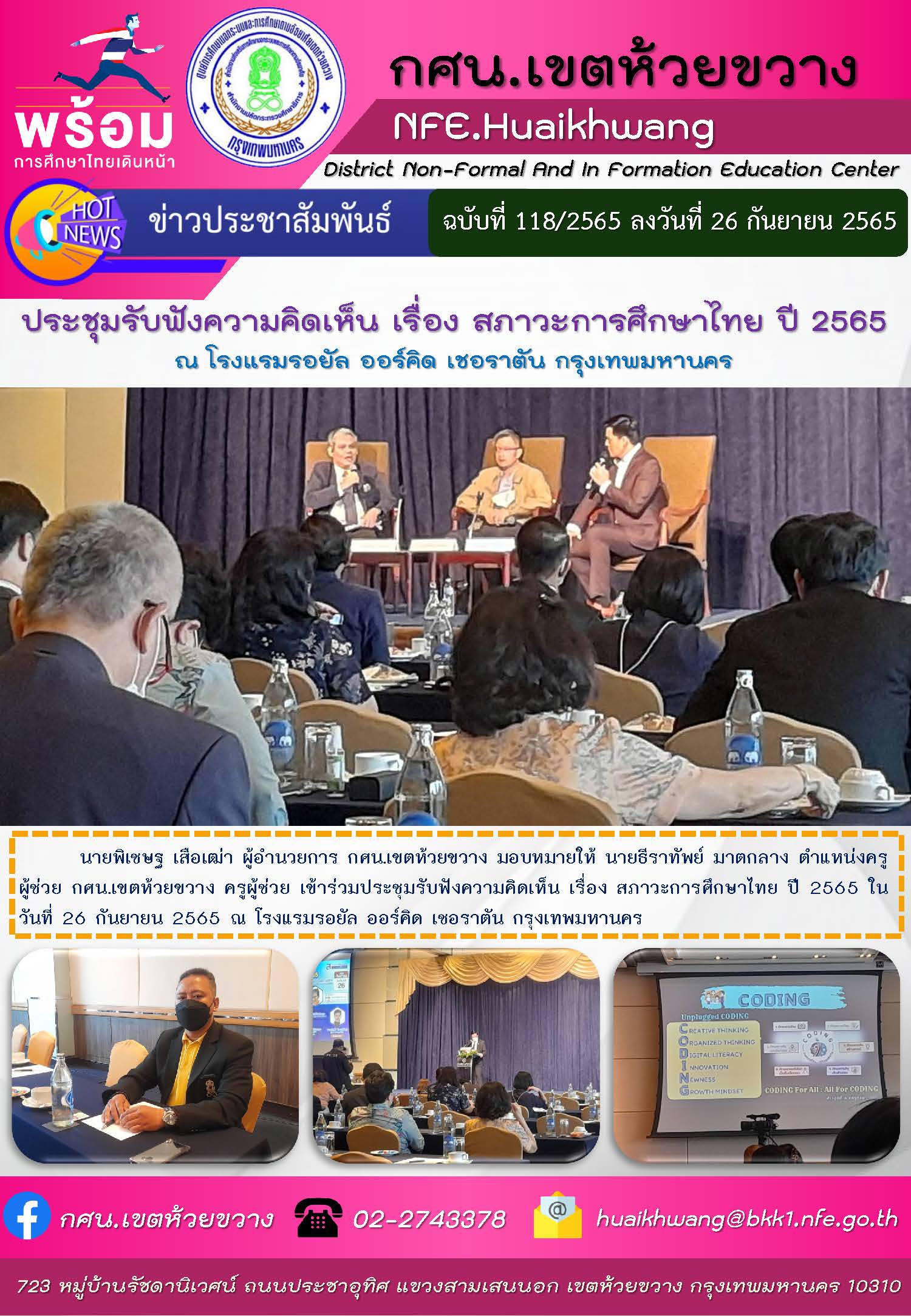 นายพิเชษฐ เสือเฒ่า ผู้อำนวยการ กศน.เขตห้วยขวาง มอบหมายให้ นายธีราทัพย์ มาตกลาง ตำแหน่งครูผู้ช่วย กศน.เขตห้วยขวาง ครูผู้ช่วย เข้าร่วมประชุมรับฟังความคิดเห็น เรื่อง สภาวะการศึกษาไทย ปี 2565 ในวันที่ 26 กันยายน 2565 ณ โรงแรมรอยัล ออร์คิด เชอราตัน กรุงเทพมหานคร