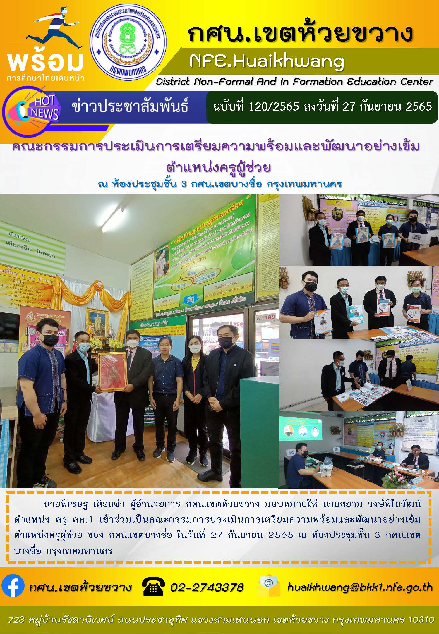 นายพิเชษฐ เสือเฒ่า ผู้อำนวยการ กศน.เขตห้วยขวาง มอบหมายให้ นายสยาม วงษ์พิไลวัฒน์ ตำแหน่ง ครู คศ.1 เข้าร่วมเป็นคณะกรรมการประเมินการเตรียมความพร้อมและพัฒนาอย่างเข้ม ตำแหน่งครูผู้ช่วย ของ กศน.เขตบางซื่อ ในวันที่ 27 กันยายน 2565 ณ ห้องประชุมชั้น 3 กศน.เขตบางซื่อ กรุงเทพมหานคร