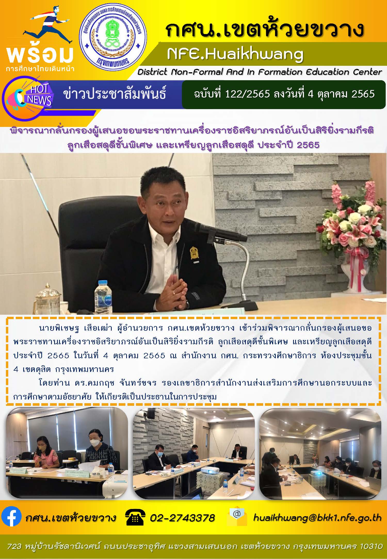นายพิเชษฐ เสือเฒ่า ผู้อำนวยการ กศน.เขตห้วยขวาง เข้าร่วมพิจารณากลั่นกรองผู้เสนอขอพระราชทานเครื่องราชอิสริยาภรณ์อันเป็นสิริยิ่งรามกีรติ ลูกเสือสดุดีชั้นพิเศษ และเหรียญลูกเสือสดุดี ประจำปี 2565 ในวันที่ 4 ตุลาคม 2565 ณ สำนักงาน กศน. กระทรวงศึกษาธิการ ห้องประชุมชั้น 4 เขตดุสิต กรุงเทพมหานคร