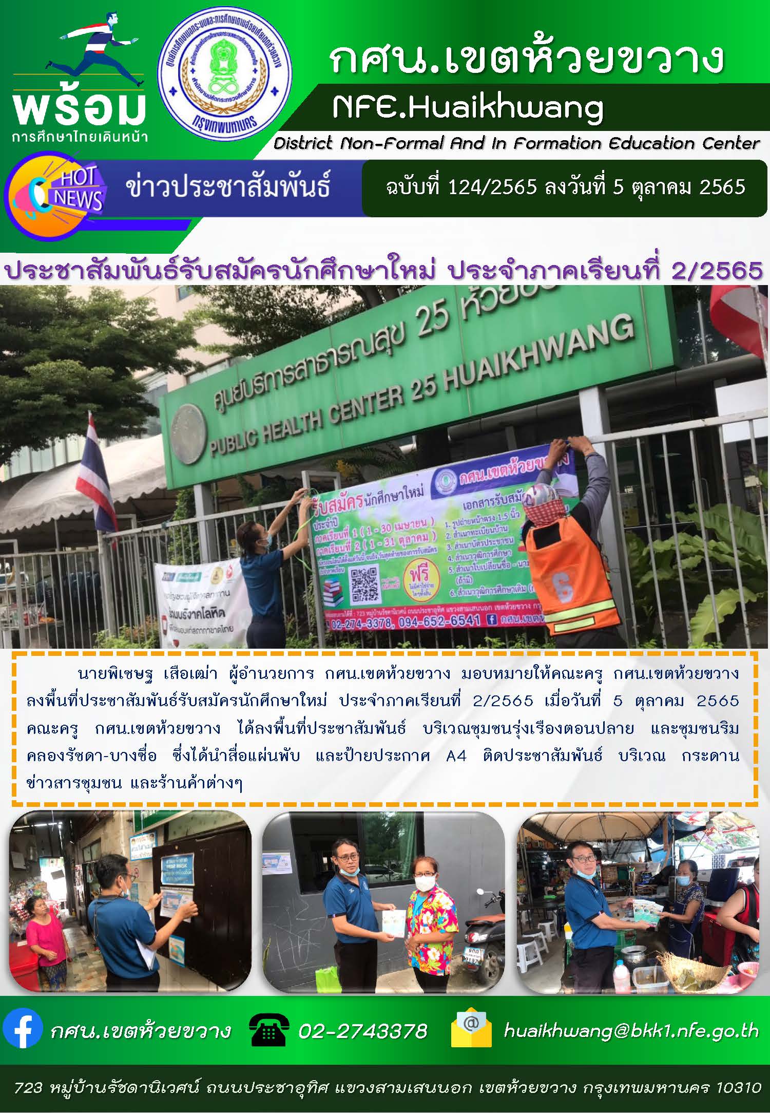 นายพิเชษฐ เสือเฒ่า ผู้อำนวยการ กศน.เขตห้วยขวาง มอบหมายให้คณะครู กศน.เขตห้วยขวาง ลงพื้นที่ประชาสัมพันธ์รับสมัครนักศึกษาใหม่ ประจำภาคเรียนที่ 2/2565 เมื่อวันที่ 5 ตุลาคม 2565 คณะครู กศน.เขตห้วยขวาง ได้ลงพื้นที่ประชาสัมพันธ์ บริเวณชุมชนรุ่งเรืองตอนปลาย และชุมชนริมคลองรัชดา-บางซื่อ ซึ่งได้นำสื่อแผ่นพับ และป้ายประกาศ A4 ติดประชาสัมพันธ์ บริเวณ กระดานข่าวสารชุมชน และร้านค้าต่างๆ