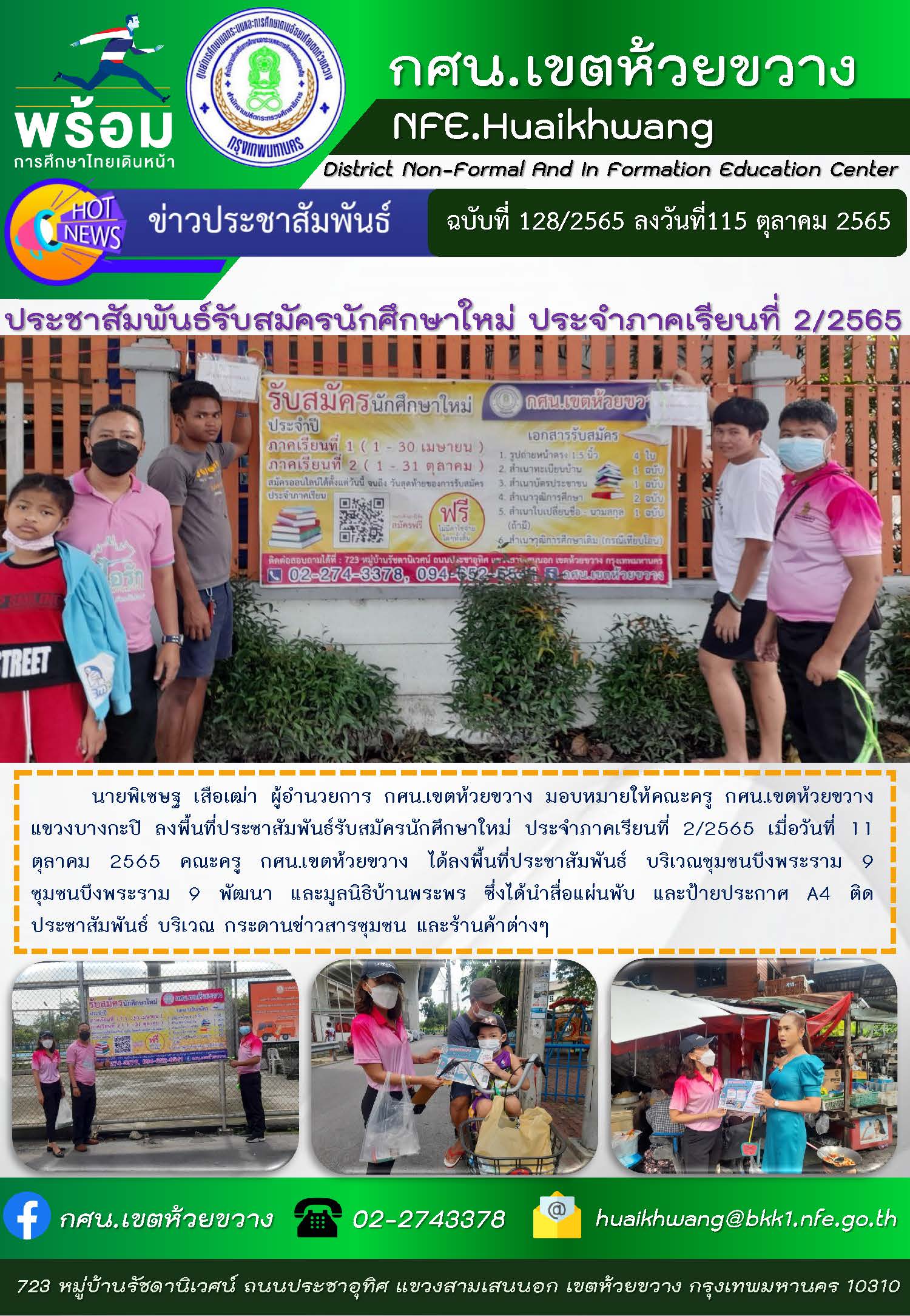 นายพิเชษฐ เสือเฒ่า ผู้อำนวยการ กศน.เขตห้วยขวาง มอบหมายให้คณะครู กศน.เขตห้วยขวาง แขวงบางกะปิ ลงพื้นที่ประชาสัมพันธ์รับสมัครนักศึกษาใหม่ ประจำภาคเรียนที่ 2/2565 เมื่อวันที่ 11 ตุลาคม 2565 คณะครู กศน.เขตห้วยขวาง ได้ลงพื้นที่ประชาสัมพันธ์ บริเวณชุมชนบึงพระราม 9 ชุมชนบึงพระราม 9 พัฒนา และมูลนิธิบ้านพระพร ซึ่งได้นำสื่อแผ่นพับ และป้ายประกาศ A4 ติดประชาสัมพันธ์ บริเวณ กระดานข่าวสารชุมชน และร้านค้าต่างๆ