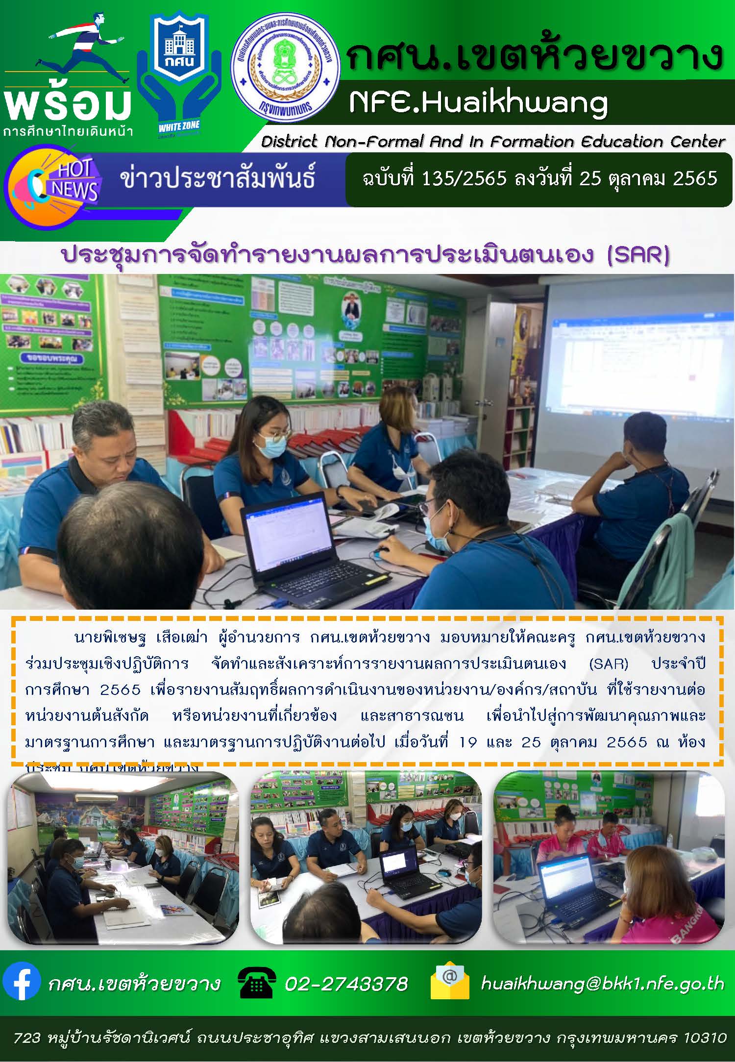 นายพิเชษฐ เสือเฒ่า ผู้อำนวยการ กศน.เขตห้วยขวาง มอบหมายให้คณะครู กศน.เขตห้วยขวาง ร่วมประชุมเชิงปฏิบัติการ จัดทำและสังเคราะห์การรายงานผลการประเมินตนเอง (SAR) ประจำปีการศึกษา 2565 เพื่อรายงานสัมฤทธิ์ผลการดำเนินงานของหน่วยงาน/องค์กร/สถาบัน ที่ใช้รายงานต่อหน่วยงานต้นสังกัด หรือหน่วยงานที่เกี่ยวข้อง และสาธารณชน เพื่อนำไปสู่การพัฒนาคุณภาพและมาตรฐานการศึกษา และมาตรฐานการปฏิบัติงานต่อไป เมื่อวันที่ 19 และ 25 ตุลาคม 2565 ณ ห้องประชุม กศน.เขตห้วยขวาง