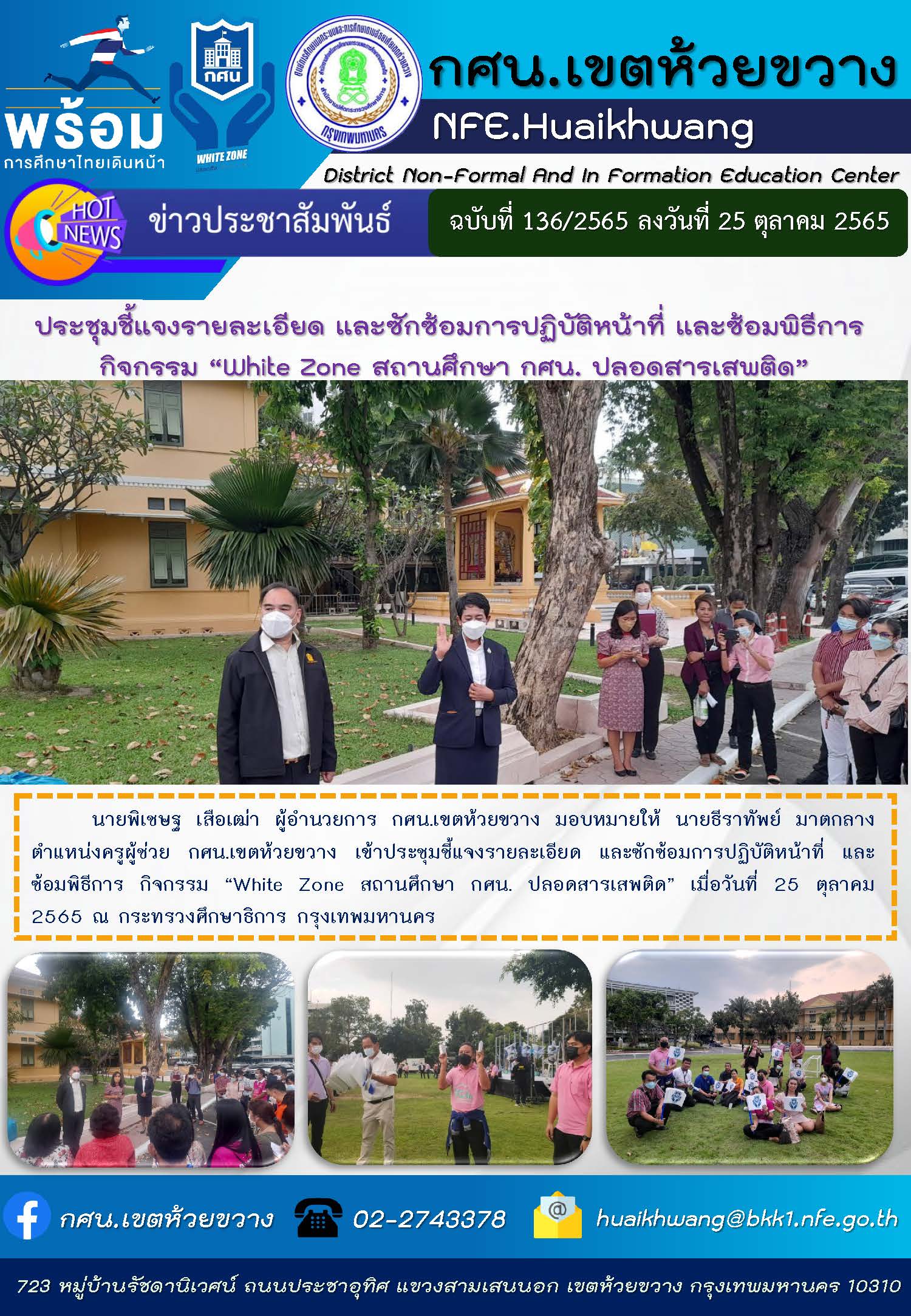 นายพิเชษฐ เสือเฒ่า ผู้อำนวยการ กศน.เขตห้วยขวาง มอบหมายให้ นายธีราทัพย์ มาตกลาง ตำแหน่งครูผู้ช่วย กศน.เขตห้วยขวาง เข้าประชุมชี้แจงรายละเอียด และซักซ้อมการปฏิบัติหน้าที่ และซ้อมพิธีการ กิจกรรม “White Zone สถานศึกษา กศน. ปลอดสารเสพติด” เมื่อวันที่ 25 ตุลาคม 2565 ณ กระทรวงศึกษาธิการ กรุงเทพมหานคร