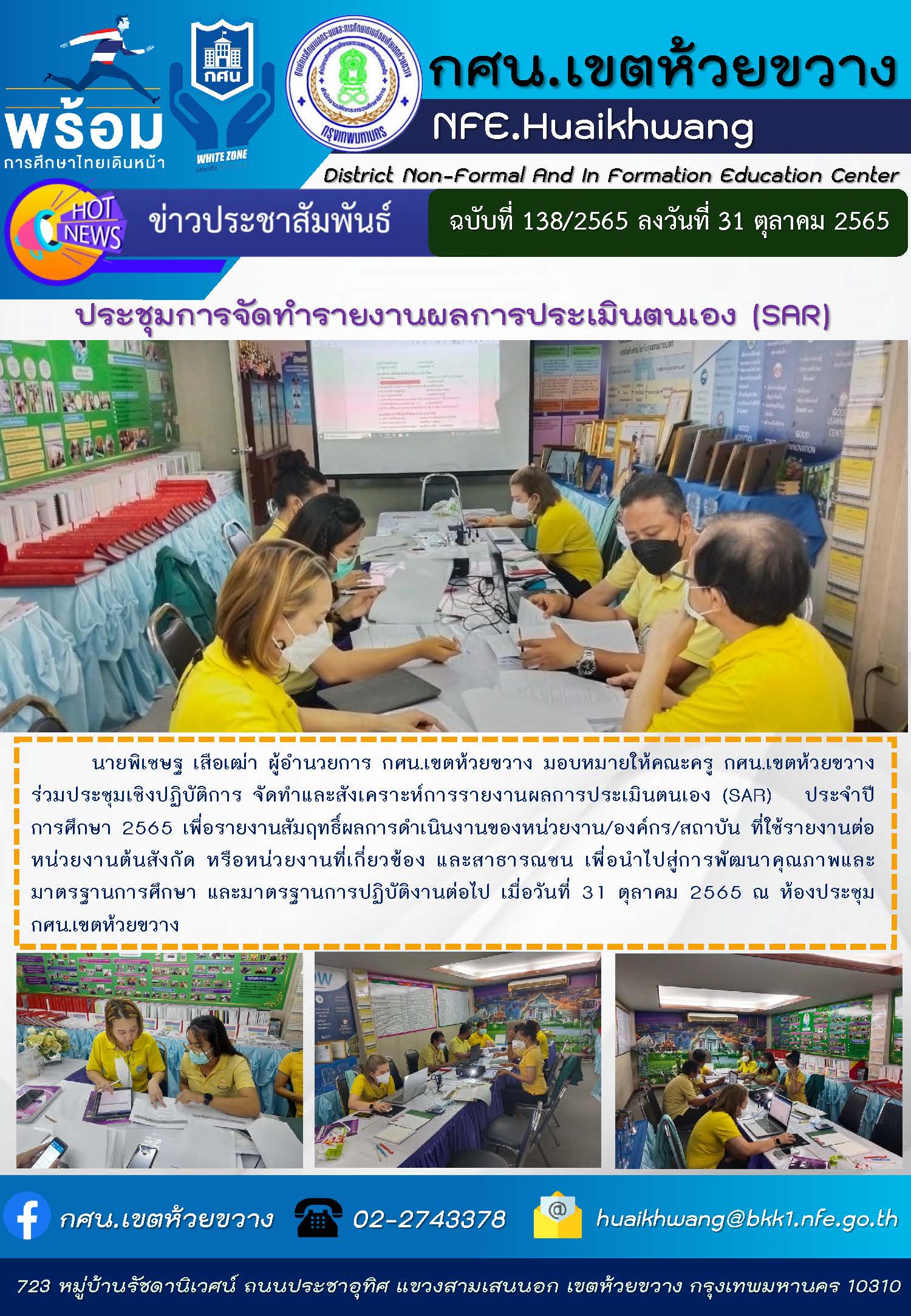 นายพิเชษฐ เสือเฒ่า ผู้อำนวยการ กศน.เขตห้วยขวาง มอบหมายให้คณะครู กศน.เขตห้วยขวาง ร่วมประชุมเชิงปฏิบัติการ จัดทำและสังเคราะห์การรายงานผลการประเมินตนเอง (SAR) ประจำปีการศึกษา 2565 เพื่อรายงานสัมฤทธิ์ผลการดำเนินงานของหน่วยงาน/องค์กร/สถาบัน ที่ใช้รายงานต่อหน่วยงานต้นสังกัด หรือหน่วยงานที่เกี่ยวข้อง และสาธารณชน เพื่อนำไปสู่การพัฒนาคุณภาพและมาตรฐานการศึกษา และมาตรฐานการปฏิบัติงานต่อไป เมื่อวันที่ 31 ตุลาคม 2565 ณ ห้องประชุม กศน.เขตห้วยขวาง