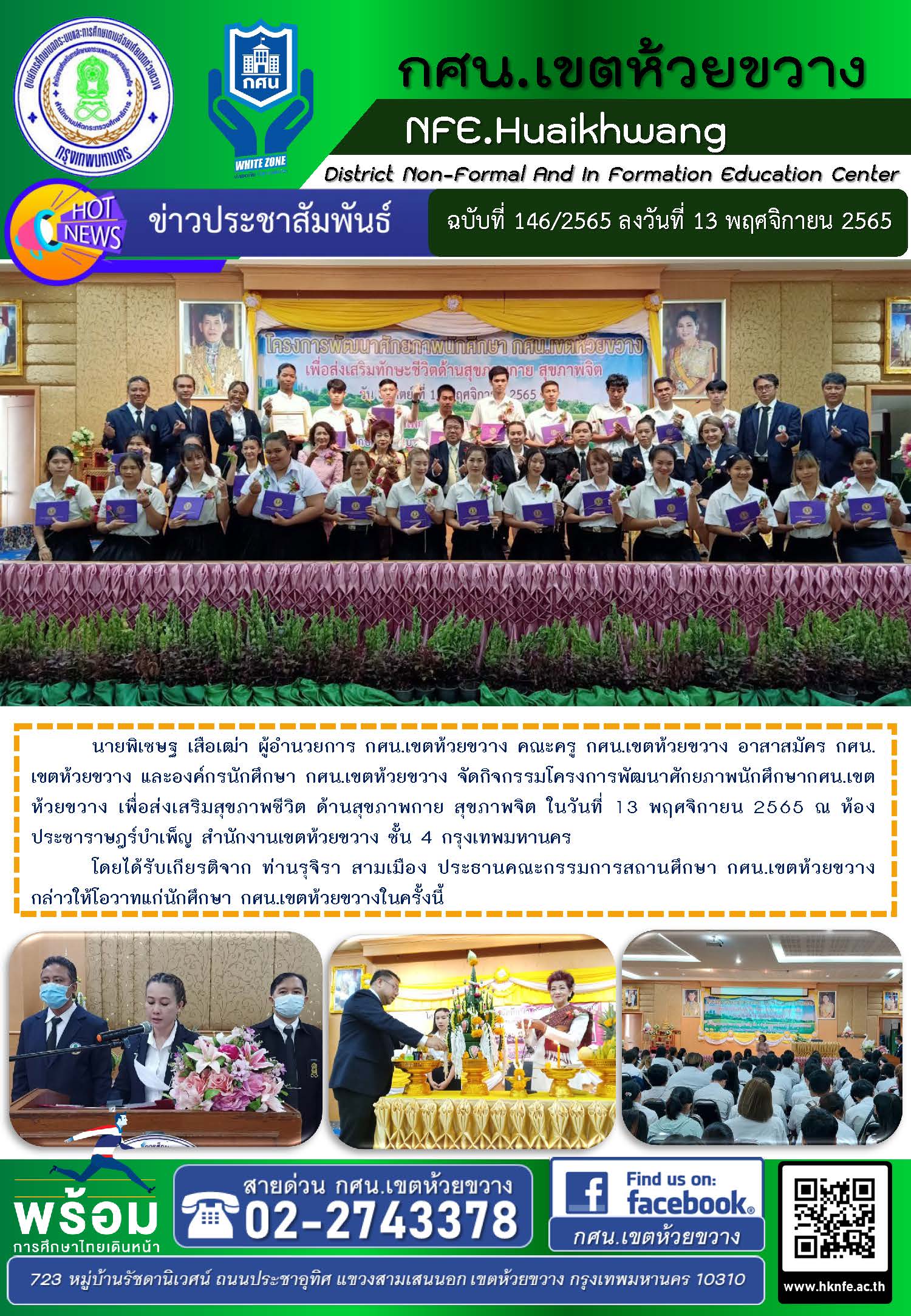 นายพิเชษฐ เสือเฒ่า ผู้อำนวยการ กศน.เขตห้วยขวาง คณะครู กศน.เขตห้วยขวาง อาสาสมัคร กศน.เขตห้วยขวาง และองค์กรนักศึกษา กศน.เขตห้วยขวาง จัดกิจกรรมโครงการพัฒนาศักยภาพนักศึกษากศน.เขตห้วยขวาง เพื่อส่งเสริมสุขภาพชีวิต ด้านสุขภาพกาย สุขภาพจิต ในวันที่ 13 พฤศจิกายน 2565 ณ ห้องประชาราษฎร์บำเพ็ญ สำนักงานเขตห้วยขวาง ชั้น 4 กรุงเทพมหานคร