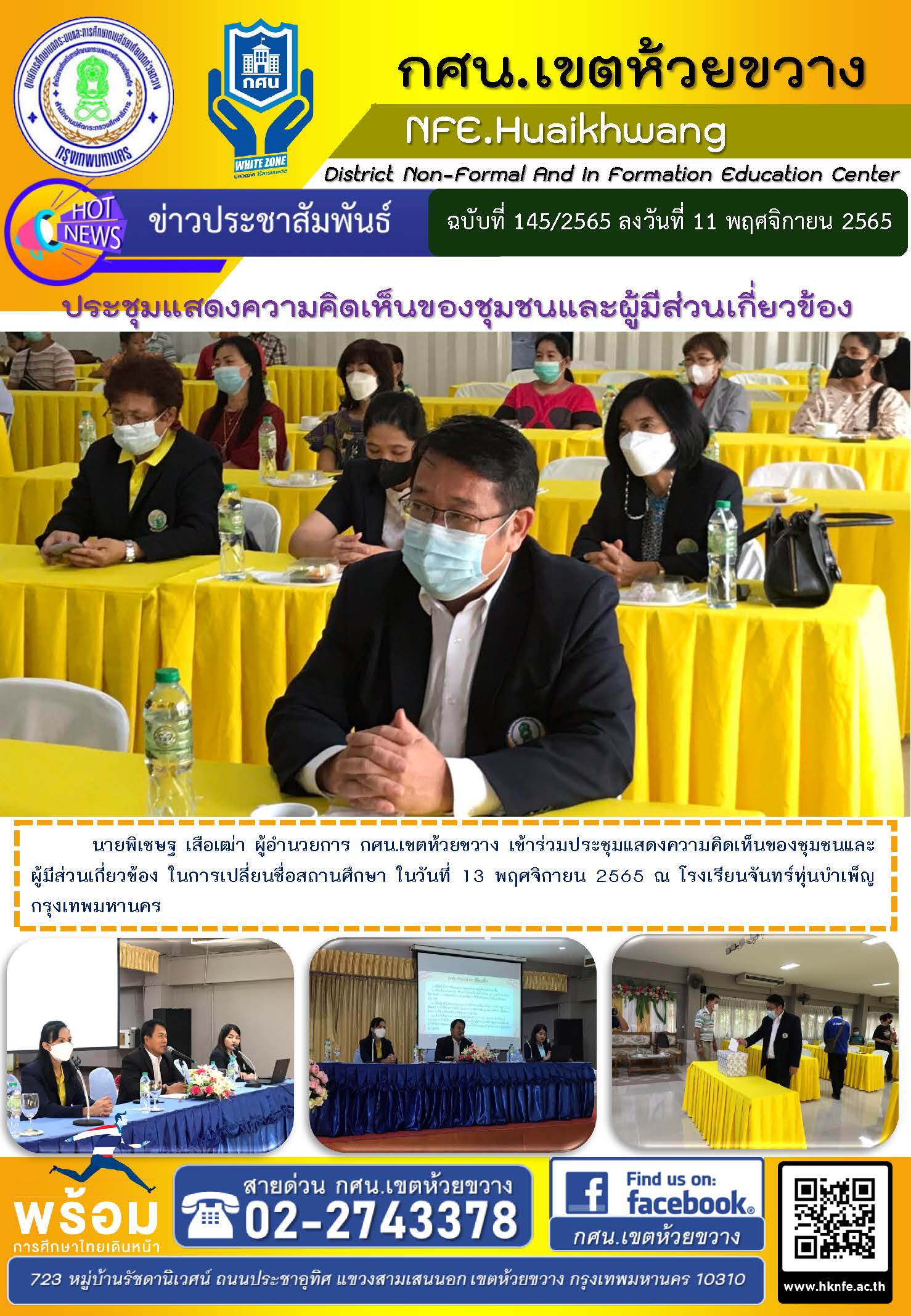 นายพิเชษฐ เสือเฒ่า ผู้อำนวยการ กศน.เขตห้วยขวาง เข้าร่วมประชุมแสดงความคิดเห็นของชุมชนและผู้มีส่วนเกี่ยวข้อง ในการเปลี่ยนชื่อสถานศึกษา ในวันที่ 13 พฤศจิกายน 2565 ณ โรงเรียนจันทร์หุ่นบำเพ็ญ กรุงเทพมหานคร
