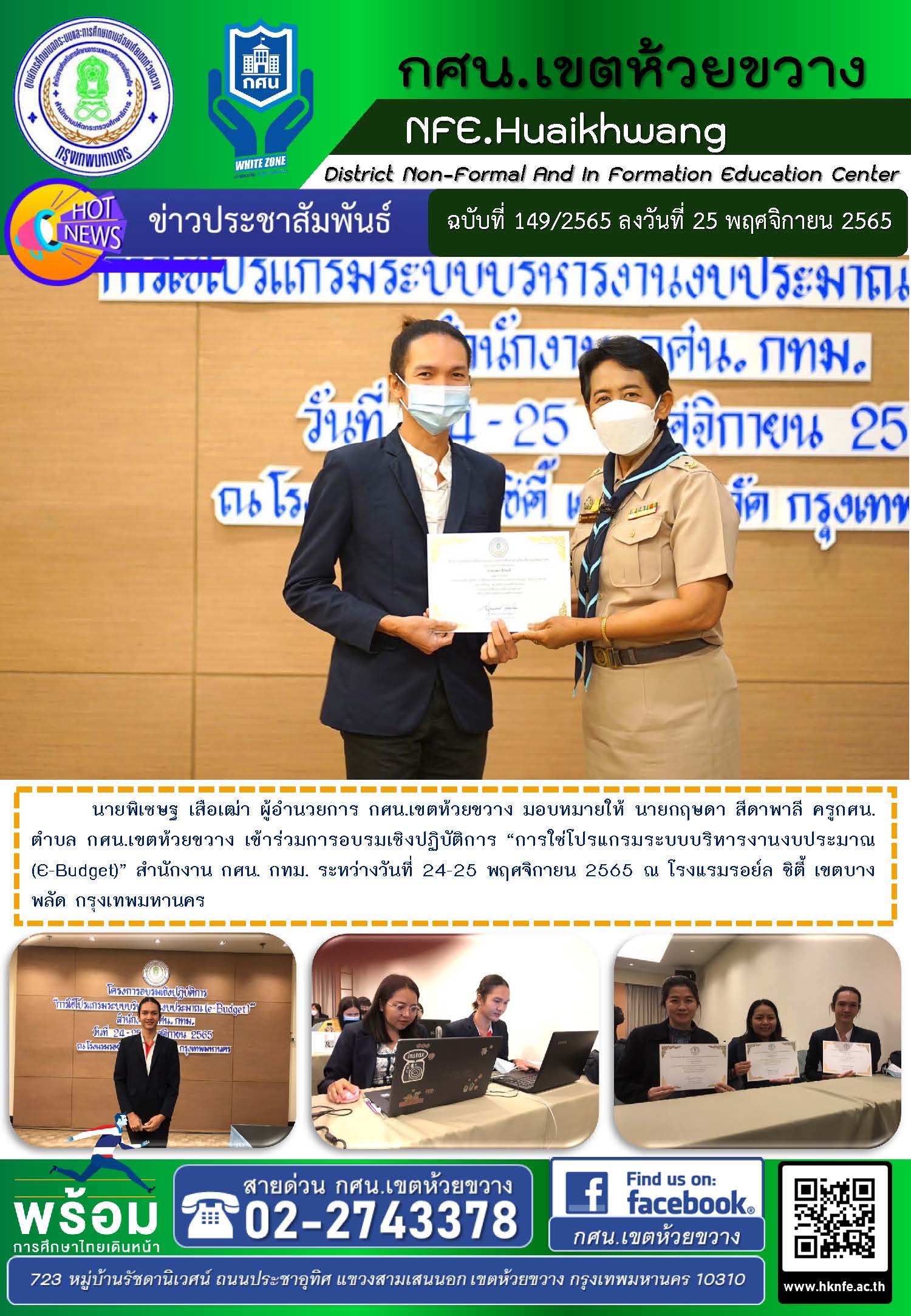 นายพิเชษฐ เสือเฒ่า ผู้อำนวยการ กศน.เขตห้วยขวาง มอบหมายให้ นายกฤษดา สีดาพาลี ครูกศน.ตำบล กศน.เขตห้วยขวาง เข้าร่วมการอบรมเชิงปฏิบัติการ “การใช่โปรแกรมระบบบริหารงานงบประมาณ (E-Budget)” สำนักงาน กศน. กทม. ระหว่างวันที่ 24-25 พฤศจิกายน 2565 ณ โรงแรมรอย์ล ซิตี้ เขตบางพลัด กรุงเทพมหานคร