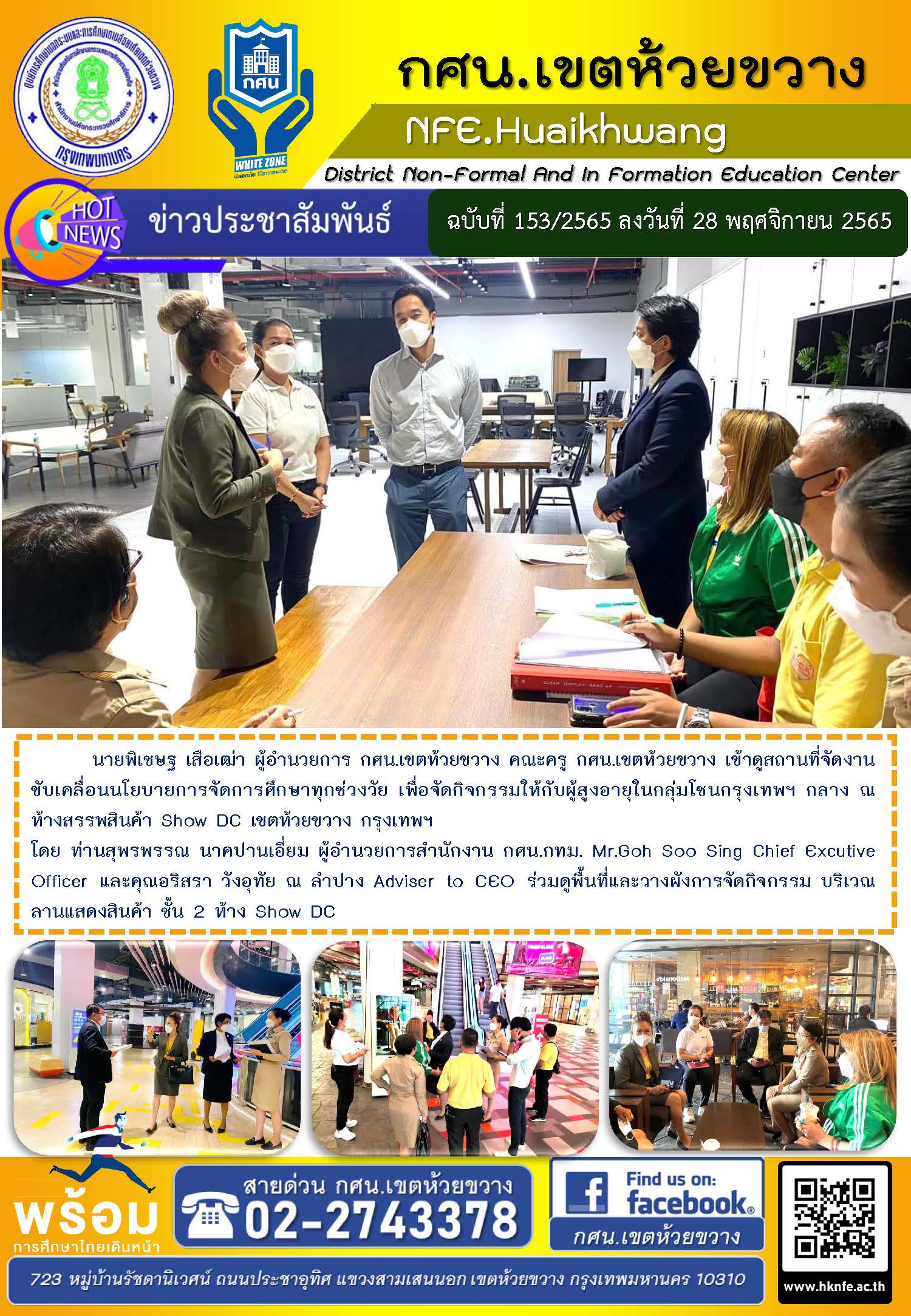 นายพิเชษฐ เสือเฒ่า ผู้อำนวยการ กศน.เขตห้วยขวาง คณะครู กศน.เขตห้วยขวาง เข้าดูสถานที่จัดงานขับเคลื่อนนโยบายการจัดการศึกษาทุกช่วงวัย เพื่อจัดกิจกรรมให้กับผู้สูงอายุในกลุ่มโซนกรุงเทพฯ กลาง ณ ห้างสรรพสินค้า Show DC เขตห้วยขวาง กรุงเทพฯ