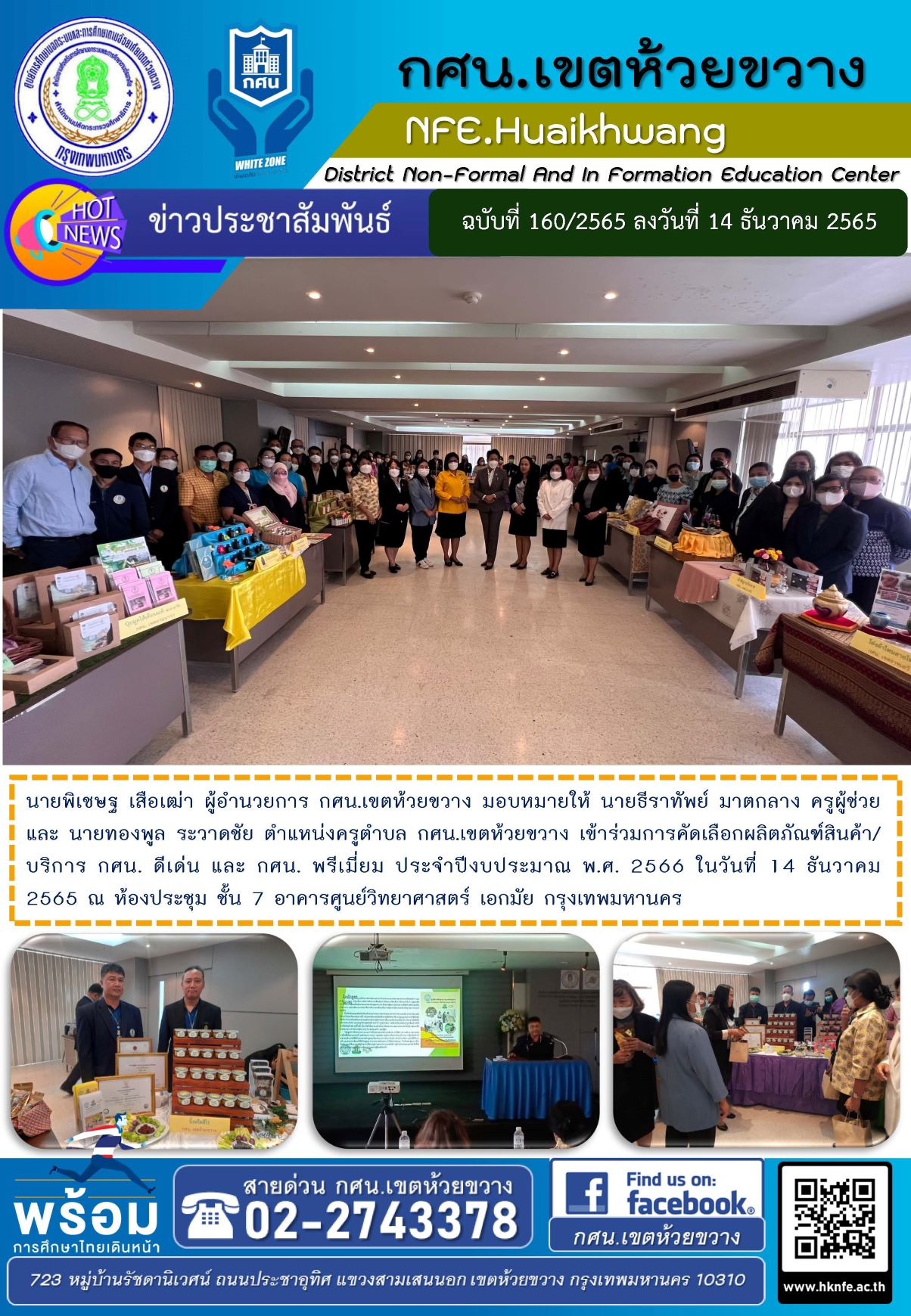 นายพิเชษฐ เสือเฒ่า ผู้อำนวยการ กศน.เขตห้วยขวาง มอบหมายให้ นายธีราทัพย์ มาตกลาง ครูผู้ช่วย และ นายทองพูล ระวาดชัย ตำแหน่งครูตำบล กศน.เขตห้วยขวาง เข้าร่วมการคัดเลือกผลิตภัณฑ์สินค้า/บริการ กศน. ดีเด่น และ กศน. พรีเมี่ยม ประจำปีงบประมาณ พ.ศ. 2566 ในวันที่ 14 ธันวาคม 2565 ณ ห้องประชุม ชั้น 7 อาคารศูนย์วิทยาศาสตร์ เอกมัย กรุงเทพมหานคร