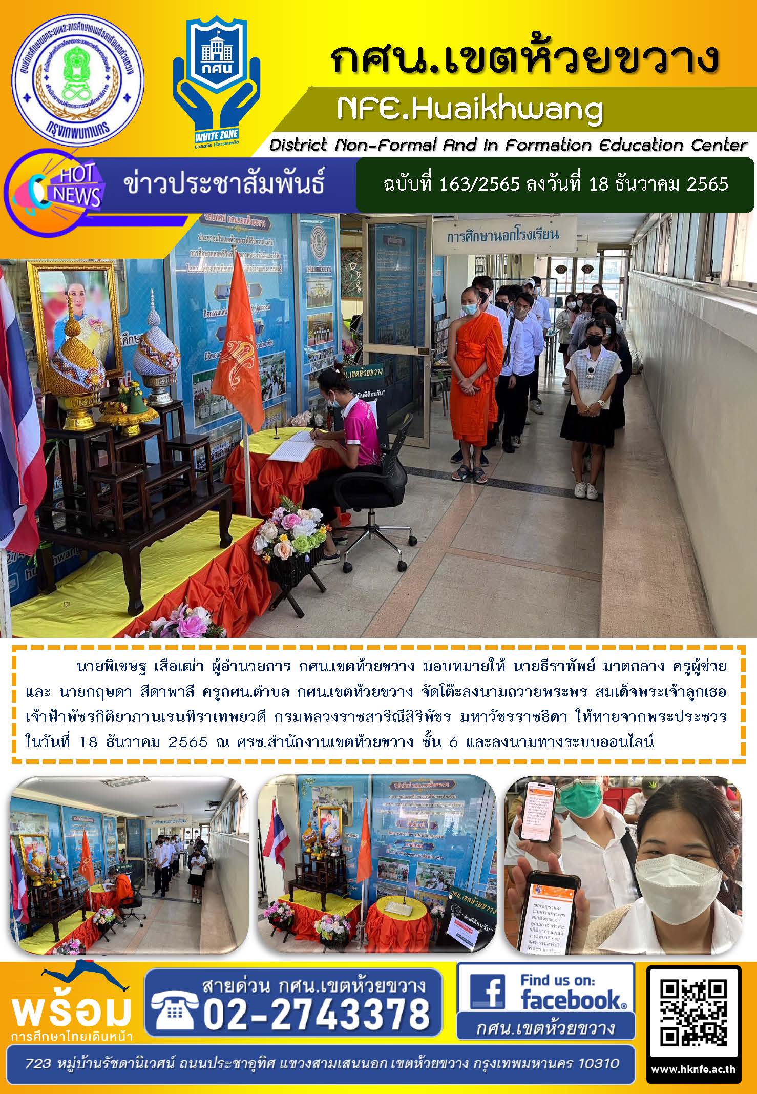 นายพิเชษฐ เสือเฒ่า ผู้อำนวยการ กศน.เขตห้วยขวาง มอบหมายให้ นายธีราทัพย์ มาตกลาง ครูผู้ช่วย และ นายกฤษดา สีดาพาลี ครูกศน.ตำบล กศน.เขตห้วยขวาง จัดโต๊ะลงนามถวายพระพร สมเด็จพระเจ้าลูกเธอเจ้าฟ้าพัชรกิติยาภานเรนทิราเทพยวดี กรมหลวงราชสาริณีสิริพัชร มหาวัชรราชธิดา ให้หายจากพระประชวร ในวันที่ 18 ธันวาคม 2565 ณ ศรช.สำนักงานเขตห้วยขวาง ชั้น 6 และลงนามทางระบบออนไลน์