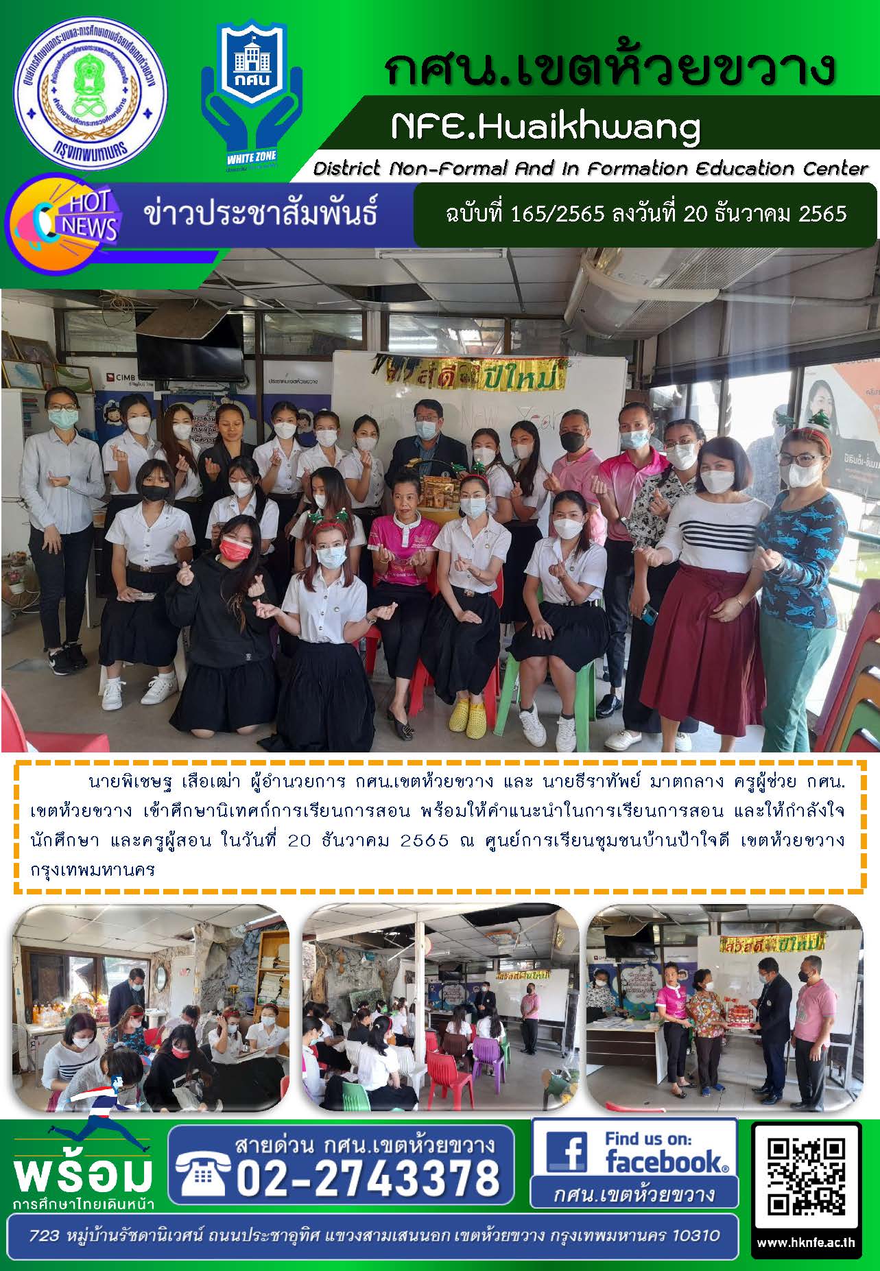 นายพิเชษฐ เสือเฒ่า ผู้อำนวยการ กศน.เขตห้วยขวาง และ นายธีราทัพย์ มาตกลาง ครูผู้ช่วย กศน.เขตห้วยขวาง เข้าศึกษานิเทศก์การเรียนการสอน พร้อมให้คำแนะนำในการเรียนการสอน และให้กำลังใจนักศึกษา และครูผู้สอน ในวันที่ 20 ธันวาคม 2565 ณ ศูนย์การเรียนชุมชนบ้านป้าใจดี เขตห้วยขวาง กรุงเทพมหานคร
