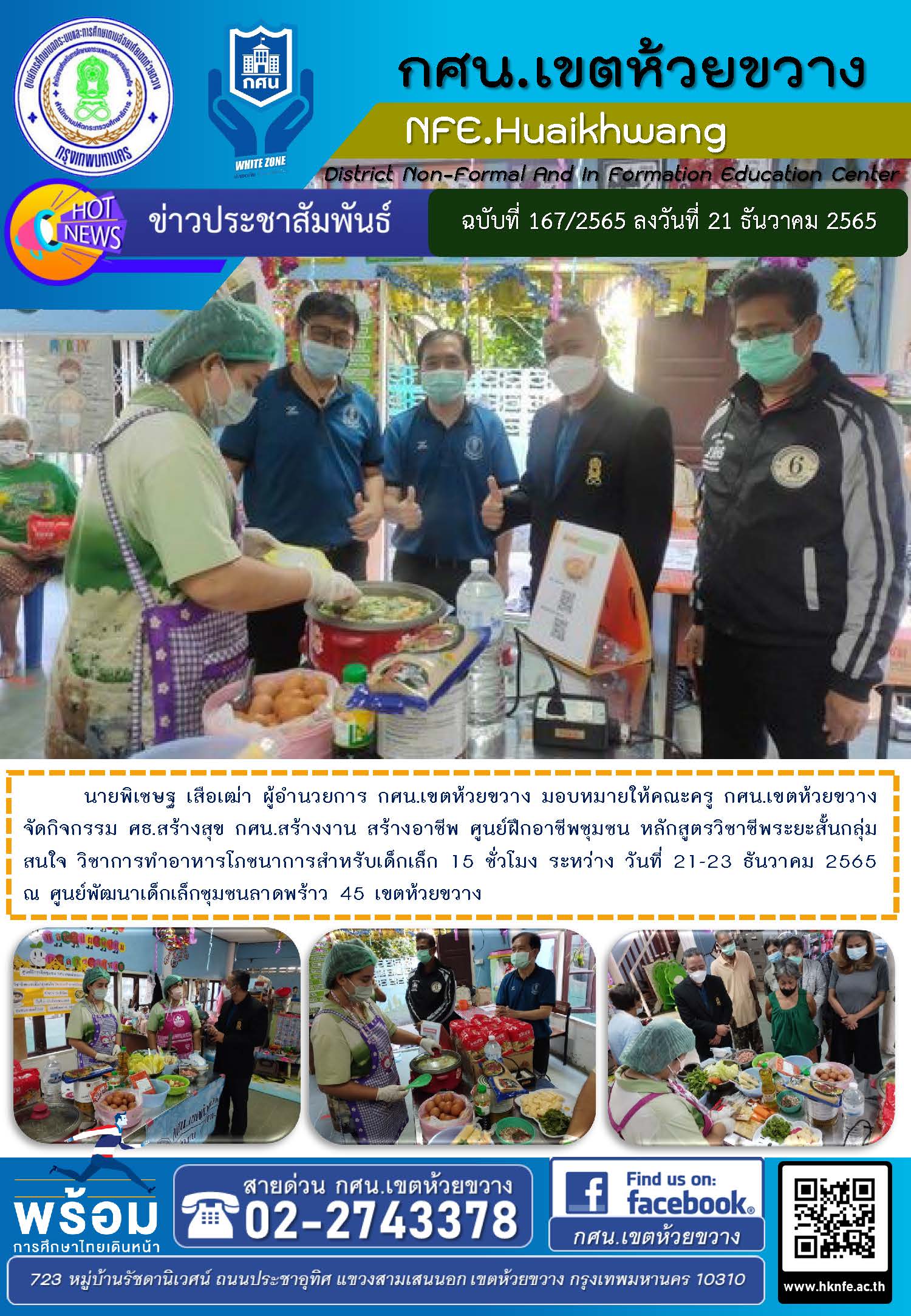 นายพิเชษฐ เสือเฒ่า ผู้อำนวยการ กศน.เขตห้วยขวาง มอบหมายให้คณะครู กศน.เขตห้วยขวาง จัดกิจกรรม ศธ.สร้างสุข กศน.สร้างงาน สร้างอาชีพ ศูนย์ฝึกอาชีพชุมชน หลักสูตรวิชาชีพระยะสั้นกลุ่มสนใจ วิชาการทำอาหารโภชนาการสำหรับเด็กเล็ก 15 ชั่วโมง ระหว่าง วันที่ 21-23 ธันวาคม 2565 ณ ศูนย์พัฒนาเด็กเล็กชุมชนลาดพร้าว 45 เขตห้วยขวาง
