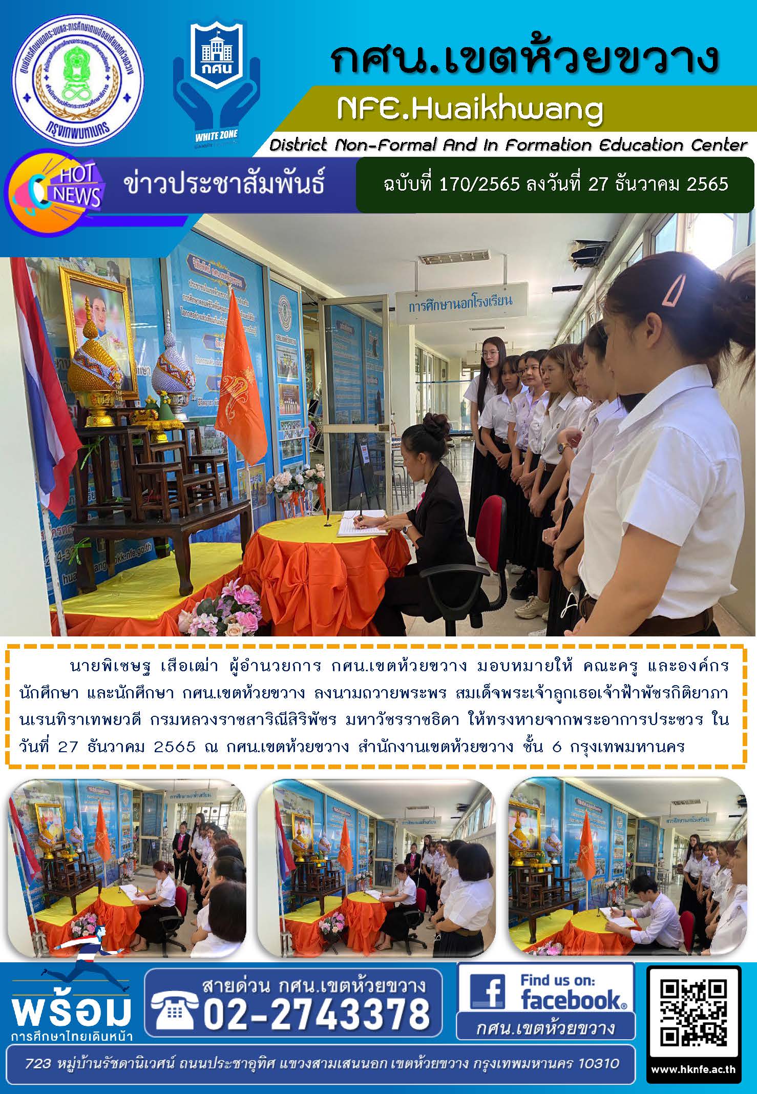 นายพิเชษฐ เสือเฒ่า ผู้อำนวยการ กศน.เขตห้วยขวาง มอบหมายให้ คณะครู และองค์กรนักศึกษา และนักศึกษา กศน.เขตห้วยขวาง ลงนามถวายพระพร สมเด็จพระเจ้าลูกเธอเจ้าฟ้าพัชรกิติยาภา นเรนทิราเทพยวดี กรมหลวงราชสาริณีสิริพัชร มหาวัชรราชธิดา ให้ทรงหายจากพระอาการประชวร ในวันที่ 27 ธันวาคม 2565 ณ กศน.เขตห้วยขวาง สำนักงานเขตห้วยขวาง ชั้น 6 กรุงเทพมหานคร