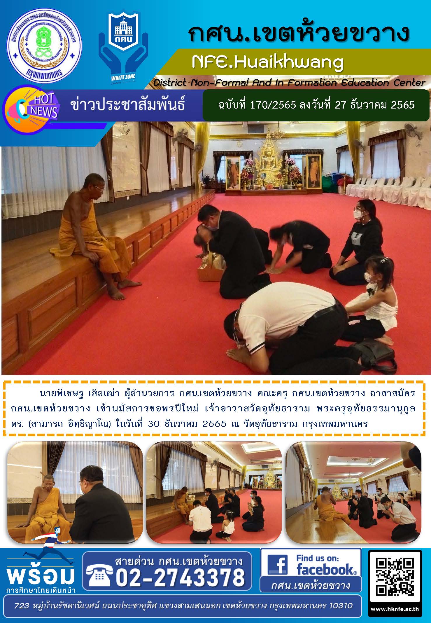นายพิเชษฐ เสือเฒ่า ผู้อำนวยการ กศน.เขตห้วยขวาง คณะครู กศน.เขตห้วยขวาง อาสาสมัคร กศน.เขตห้วยขวาง เข้านมัสการขอพรปีใหม่ เจ้าอาวาสวัดอุทัยธาราม พระครูอุทัยธรรมานุกูล ดร. (สามารถ อิทฺธิญาโณ) ในวันที่ 30 ธันวาคม 2565 ณ วัดอุทัยธาราม กรุงเทพมหานคร