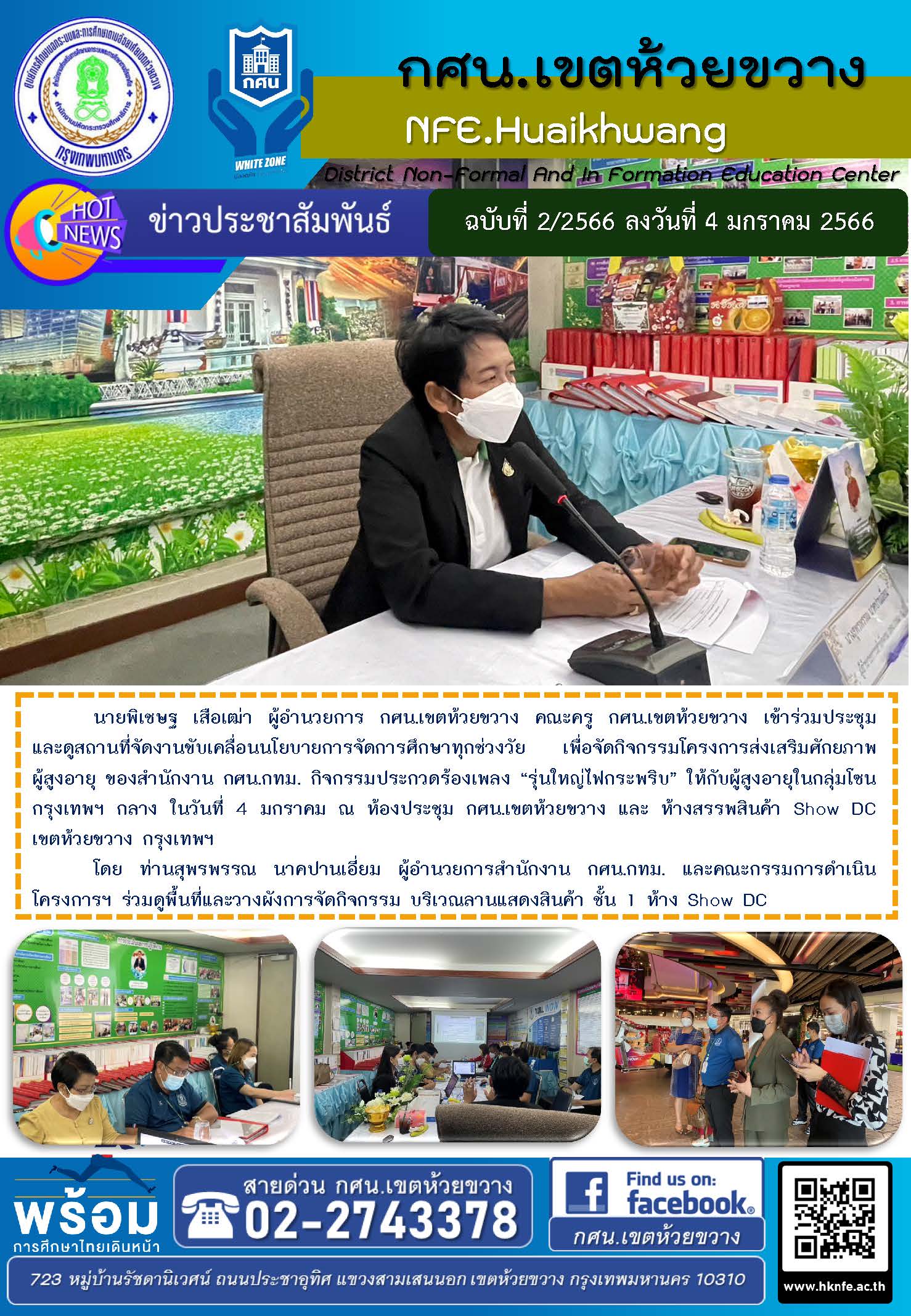 นายพิเชษฐ เสือเฒ่า ผู้อำนวยการ กศน.เขตห้วยขวาง คณะครู กศน.เขตห้วยขวาง เข้าร่วมประชุม และดูสถานที่จัดงานขับเคลื่อนนโยบายการจัดการศึกษาทุกช่วงวัย เพื่อจัดกิจกรรมโครงการส่งเสริมศักยภาพผู้สูงอายุ ของสำนักงาน กศน.กทม. กิจกรรมประกวดร้องเพลง “รุ่นใหญ่ไฟกระพริบ” ให้กับผู้สูงอายุในกลุ่มโซนกรุงเทพฯ กลาง ในวันที่ 4 มกราคม ณ ห้องประชุม กศน.เขตห้วยขวาง และ ห้างสรรพสินค้า Show DC เขตห้วยขวาง กรุงเทพฯ