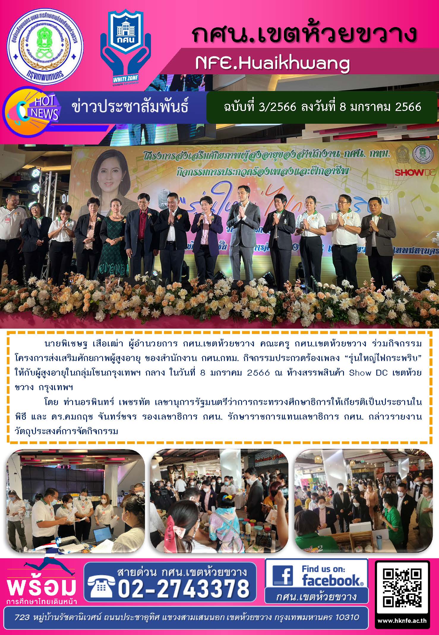 นายพิเชษฐ เสือเฒ่า ผู้อำนวยการ กศน.เขตห้วยขวาง คณะครู กศน.เขตห้วยขวาง ร่วมกิจกรรมโครงการส่งเสริมศักยภาพผู้สูงอายุ ของสำนักงาน กศน.กทม. กิจกรรมประกวดร้องเพลง “รุ่นใหญ่ไฟกระพริบ” ให้กับผู้สูงอายุในกลุ่มโซนกรุงเทพฯ กลาง ในวันที่ 8 มกราคม 2566 ณ ห้างสรรพสินค้า Show DC เขตห้วยขวาง กรุงเทพฯ