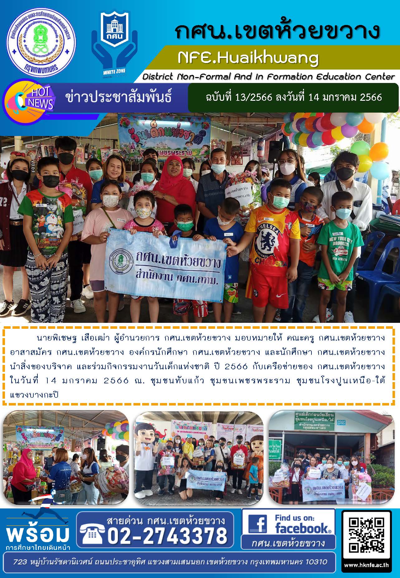 นายพิเชษฐ เสือเฒ่า ผู้อำนวยการ กศน.เขตห้วยขวาง มอบหมายให้ คณะครู กศน.เขตห้วยขวาง อาสาสมัคร กศน.เขตห้วยขวาง องค์กรนักศึกษา กศน.เขตห้วยขวาง และนักศึกษา กศน.เขตห้วยขวาง นำสิ่งของบริจาค และร่วมกิจกรรมงานวันเด็กแห่งชาติ ปี 2566 กับเครือข่ายของ กศน.เขตห้วยขวาง ในวันที่ 14 มกราคม 2566 ณ. ชุมชนร่วมใจพิบูลย์ 2 ชุมชนริมคลองรัชดาบางซื่อ ชุมชนลาดพร้าว 45 แขวงสามเสนนอก