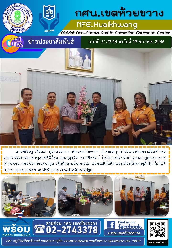 นายพิเชษฐ เสือเฒ่า ผู้อำนวยการ กศน.เขตห้วยขวาง นำคณะครู เข้าเยี่ยมแสดงความยินดี และมอบกระเช้าของขวัญสวัสดีปีใหม่ ผอ.บุญเลิศ ตองติดรัมย์ ในโอกาสเข้ารับตำแหน่ง ผู้อำนวยการสำนักงาน กศน.จังหวัดนครปฐม เพื่อสืบสานวัฒนธรรม ประเพณีอันดีงามของไทยให้คงอยู่สืบไป ในวันที่ 19 มกราคม 2566 ณ สำนักงาน กศน.จังหวัดนครปฐม