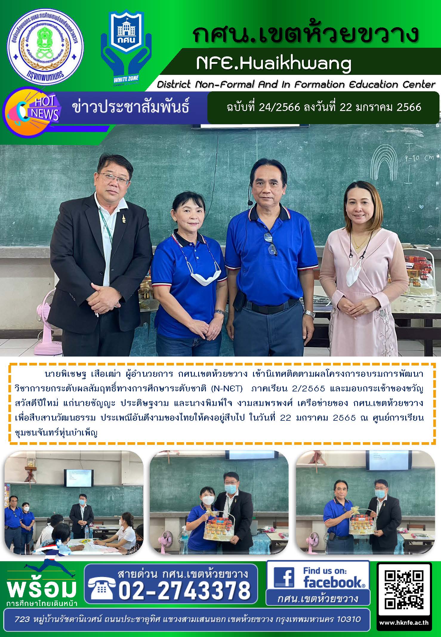 นายพิเชษฐ เสือเฒ่า ผู้อำนวยการ กศน.เขตห้วยขวาง เข้านิเทศติดตามผลโครงการอบรมการพัฒนาวิชาการยกระดับผลสัมฤทธิ์ทางการศึกษาระดับชาติ (N-NET) ภาคเรียน 2/2565 และมอบกระเช้าของขวัญสวัสดีปีใหม่ แก่นายชัญญะ ประดิษฐงาม และนางพิมพ์ใจ งามสมพรพงศ์ เครือข่ายของ กศน.เขตห้วยขวาง เพื่อสืบสานวัฒนธรรม ประเพณีอันดีงามของไทยให้คงอยู่สืบไป ในวันที่ 22 มกราคม 2565 ณ ศูนย์การเรียนชุมชนจันทร์หุ่นบำเพ็ญ