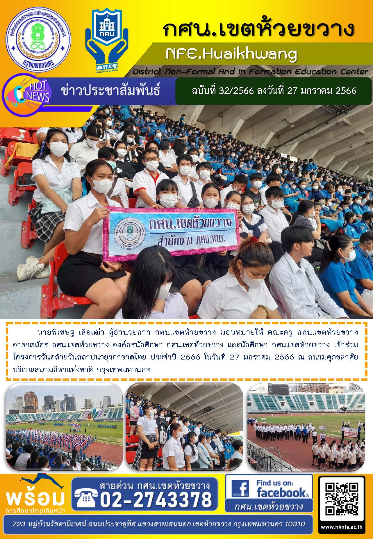 นายพิเชษฐ เสือเฒ่า ผู้อำนวยการ กศน.เขตห้วยขวาง มอบหมายให้ คณะครู กศน.เขตห้วยขวาง อาสาสมัคร กศน.เขตห้วยขวาง องค์กรนักศึกษา กศน.เขตห้วยขวาง และนักศึกษา กศน.เขตห้วยขวาง เข้าร่วมโครงการวันคล้ายวันสถาปนายุวกาชาดไทย ประจำปี 2566 ในวันที่ 27 มกราคม 2566 ณ สนามศุภชลาศัย บริเวณสนามกีฬาแห่งชาติ กรุงเทพมหานคร