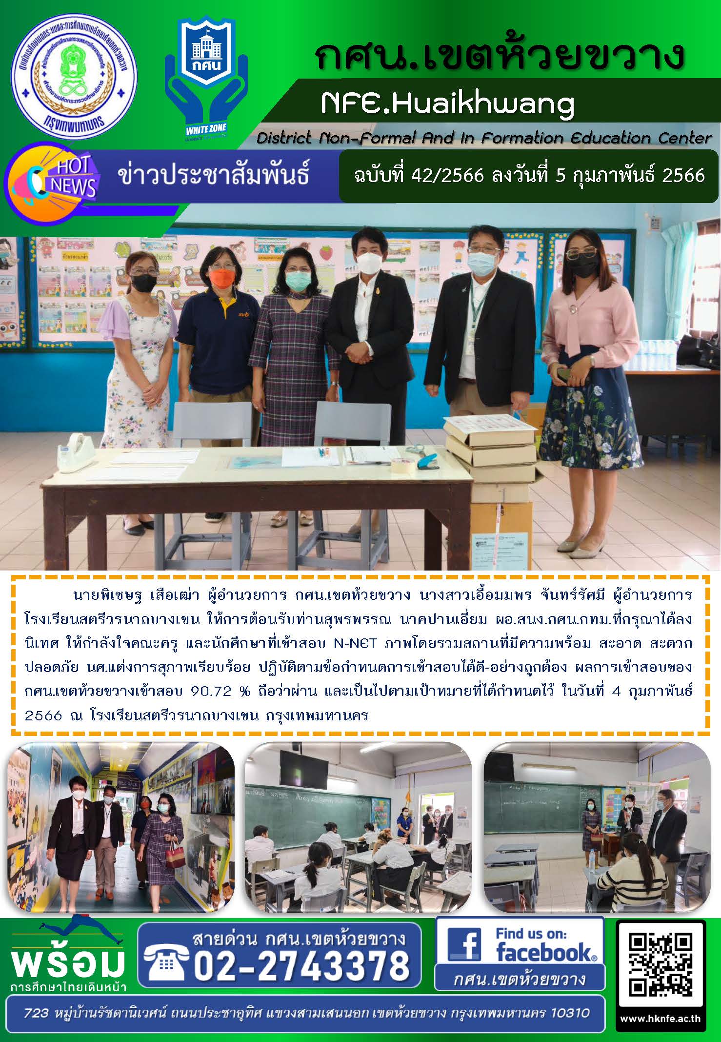 นายพิเชษฐ เสือเฒ่า ผู้อำนวยการ กศน.เขตห้วยขวาง นางสาวเอื้อมมพร จันทร์รัศมี ผู้อำนวยการโรงเรียนสตรีวรนาถบางเขน ให้การต้อนรับท่านสุพรพรรณ นาคปานเอี่ยม ผอ.สนง.กศน.กทม.ที่กรุณาได้ลงนิเทศ ให้กำลังใจคณะครู และนักศึกษาที่เข้าสอบ N-NET ภาพโดยรวมสถานที่มีความพร้อม สะอาด สะดวกปลอดภัย นศ.แต่งการสุภาพเรียบร้อย ปฏิบัติตามข้อกำหนดการเข้าสอบได้ดี-อย่างถูกต้อง ผลการเข้าสอบของ กศน.เขตห้วยขวางเข้าสอบ 90.72 % ถือว่าผ่าน และเป็นไปตามเป้าหมายที่ได้กำหนดไว้ ในวันที่ 4 กุมภาพันธ์ 2566 ณ โรงเรียนสตรีวรนาถบางเขน กรุงเทพมหานคร
