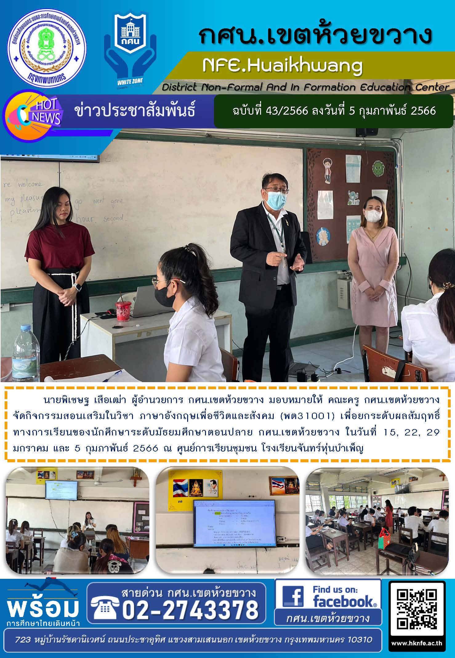 นายพิเชษฐ เสือเฒ่า ผู้อำนวยการ กศน.เขตห้วยขวาง มอบหมายให้ คณะครู กศน.เขตห้วยขวาง จัดกิจกรรมสอนเสริมในวิชา ภาษาอังกฤษเพื่อชีวิตและสังคม (พต31001) เพื่อยกระดับผลสัมฤทธิ์ทางการเรียนของนักศึกษาระดับมัธยมศึกษาตอนปลาย กศน.เขตห้วยขวาง ในวันที่ 15, 22, 29 มกราคม และ 5 กุมภาพันธ์ 2566 ณ ศูนย์การเรียนชุมชน โรงเรียนจันทร์หุ่นบำเพ็ญ