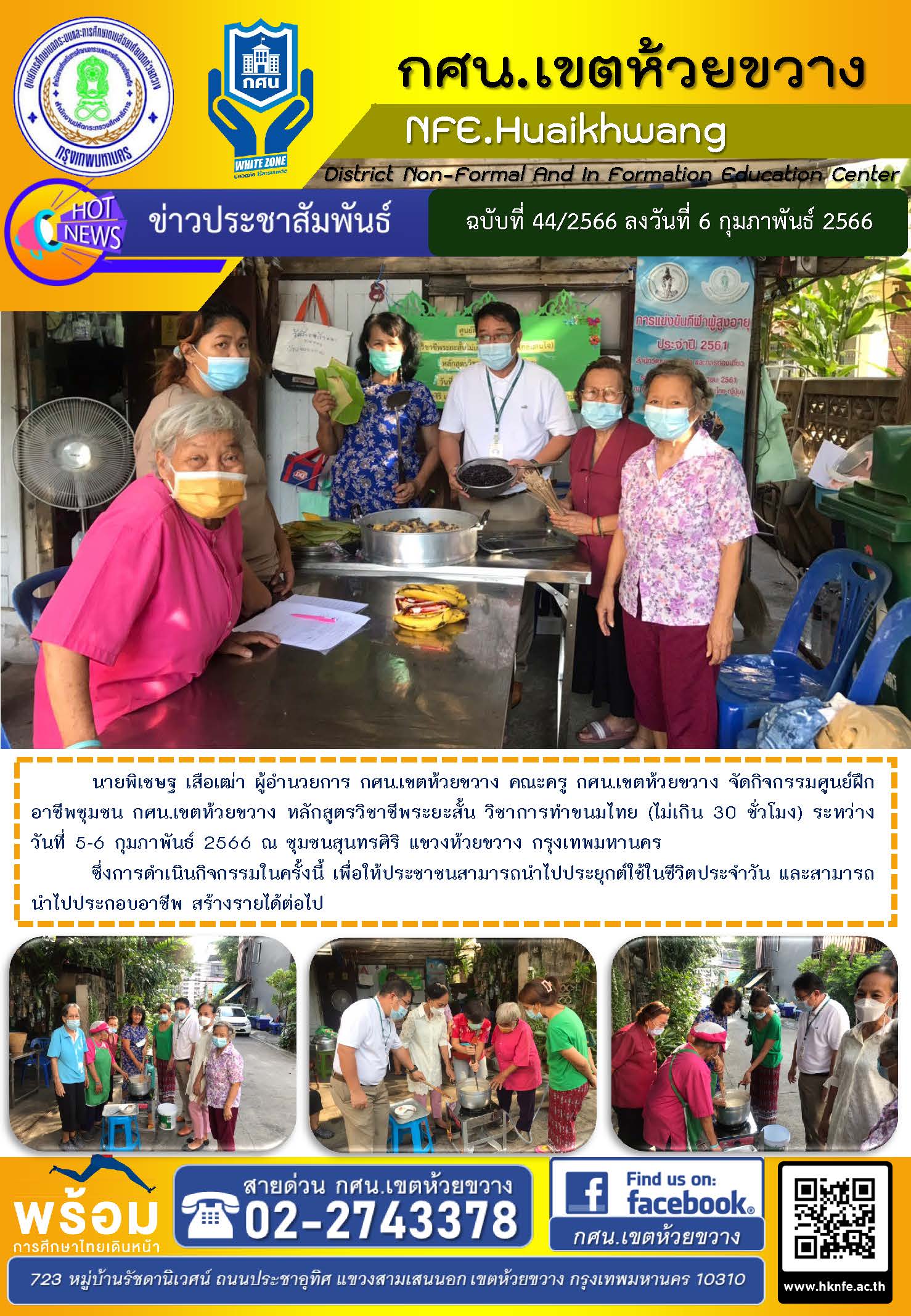 นายพิเชษฐ เสือเฒ่า ผู้อำนวยการ กศน.เขตห้วยขวาง คณะครู กศน.เขตห้วยขวาง จัดกิจกรรมศูนย์ฝึกอาชีพชุมชน กศน.เขตห้วยขวาง หลักสูตรวิชาชีพระยะสั้น วิชาการทำขนมไทย (ข้าวต้มมัด) (ไม่เกิน 30 ชั่วโมง) ระหว่างวันที่ 5-6 กุมภาพันธ์ 2566 ณ ชุมชนสุนทรศิริ แขวงห้วยขวาง กรุงเทพมหานคร