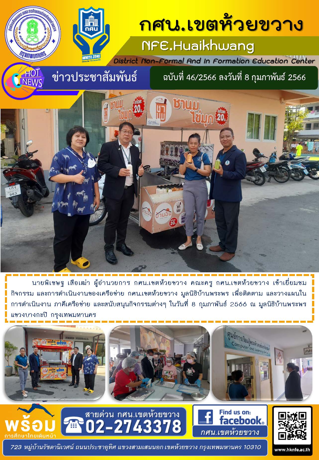 นายพิเชษฐ เสือเฒ่า ผู้อำนวยการ กศน.เขตห้วยขวาง คณะครู กศน.เขตห้วยขวาง เข้าเยี่ยมชมกิจกรรม และการดำเนินงานของเครือข่าย กศน.เขตห้วยขวาง มูลนิธิบ้านพระพร เพื่อติดตาม และวางแผนในการดำเนินงาน ภาคีเครือข่าย และสนับสนุนกิจกรรมต่างๆ ในวันที่ 8 กุมภาพันธ์ 2566 ณ มูลนิธิบ้านพระพร แขวงบางกะปิ กรุงเทพมหานคร
