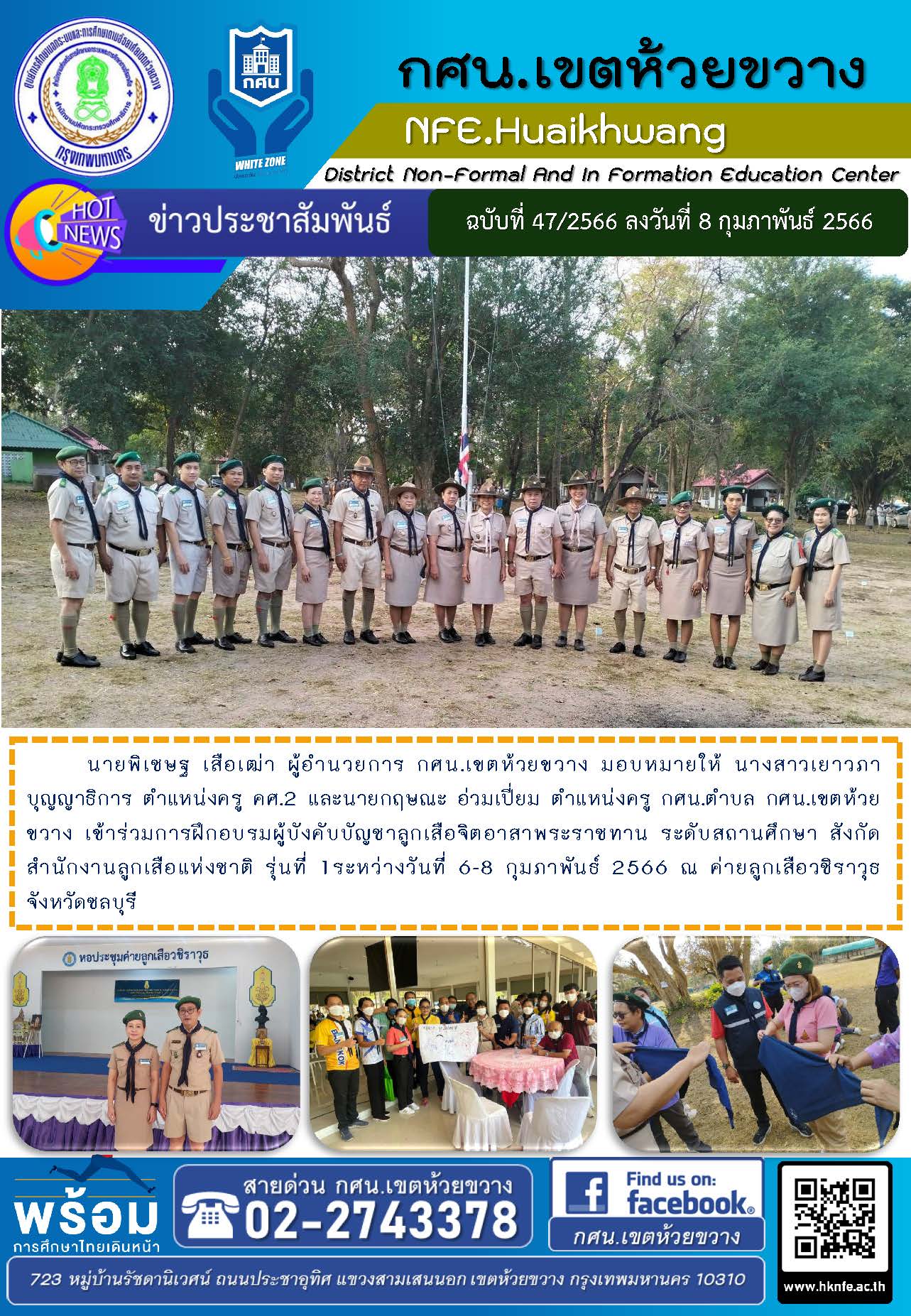 นายพิเชษฐ เสือเฒ่า ผู้อำนวยการ กศน.เขตห้วยขวาง มอบหมายให้ นางสาวเยาวภา บุญญาธิการ ตำแหน่งครู คศ.2 และนายกฤษณะ อ่วมเปี่ยม ตำแหน่งครู กศน.ตำบล กศน.เขตห้วยขวาง เข้าร่วมการฝึกอบรมผู้บังคับบัญชาลูกเสือจิตอาสาพระราชทาน ระดับสถานศึกษา สังกัดสำนักงานลูกเสือแห่งชาติ รุ่นที่ 1ระหว่างวันที่ 6-8 กุมภาพันธ์ 2566 ณ ค่ายลูกเสือวชิราวุธ จังหวัดชลบุรี