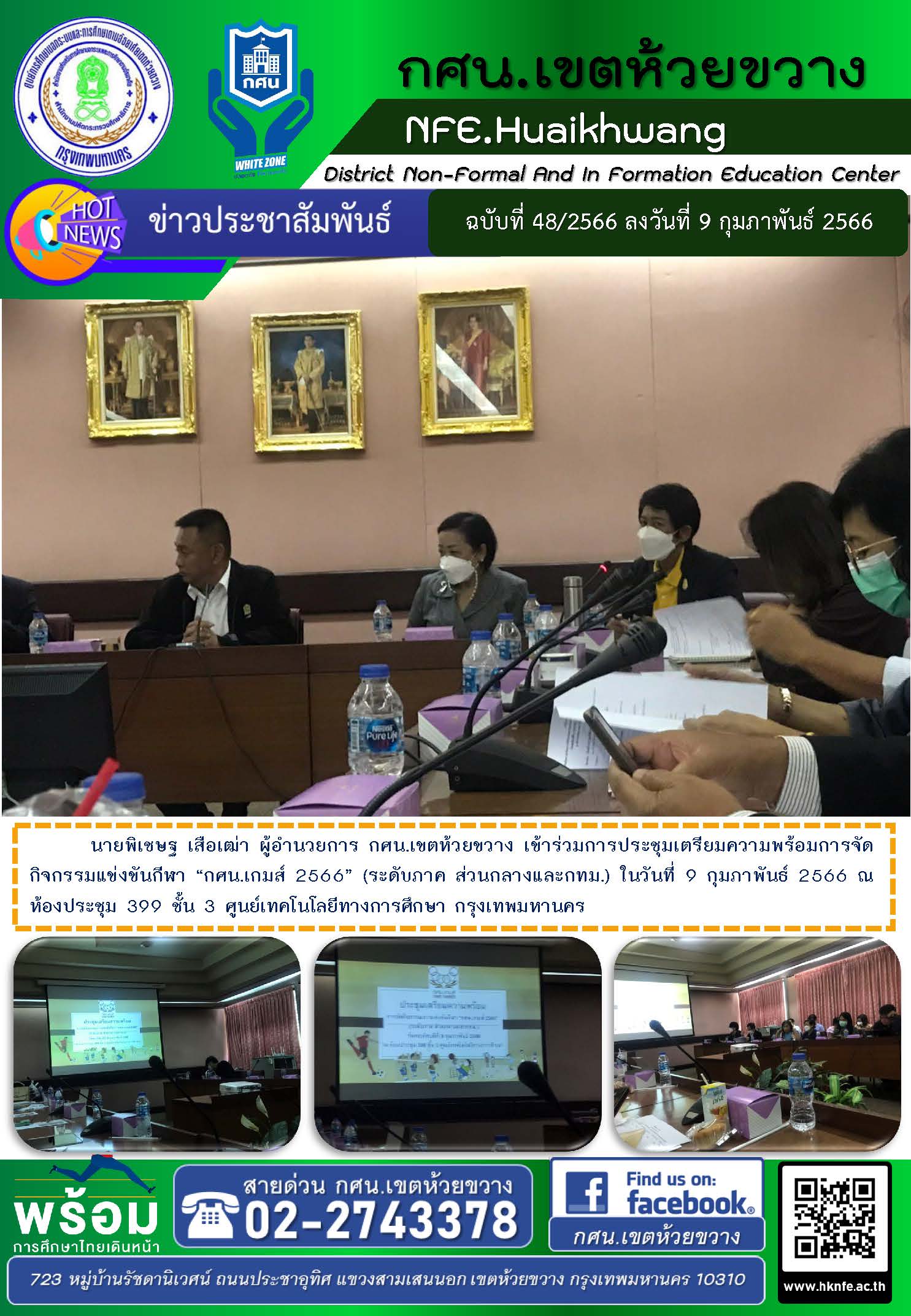 นายพิเชษฐ เสือเฒ่า ผู้อำนวยการ กศน.เขตห้วยขวาง เข้าร่วมการประชุมเตรียมความพร้อมการจัดกิจกรรมแข่งขันกีฬา “กศน.เกมส์ 2566” (ระดับภาค ส่วนกลางและกทม.) ในวันที่ 9 กุมภาพันธ์ 2566 ณ ห้องประชุม 399 ชั้น 3 ศูนย์เทคโนโลยีทางการศึกษา กรุงเทพมหานคร