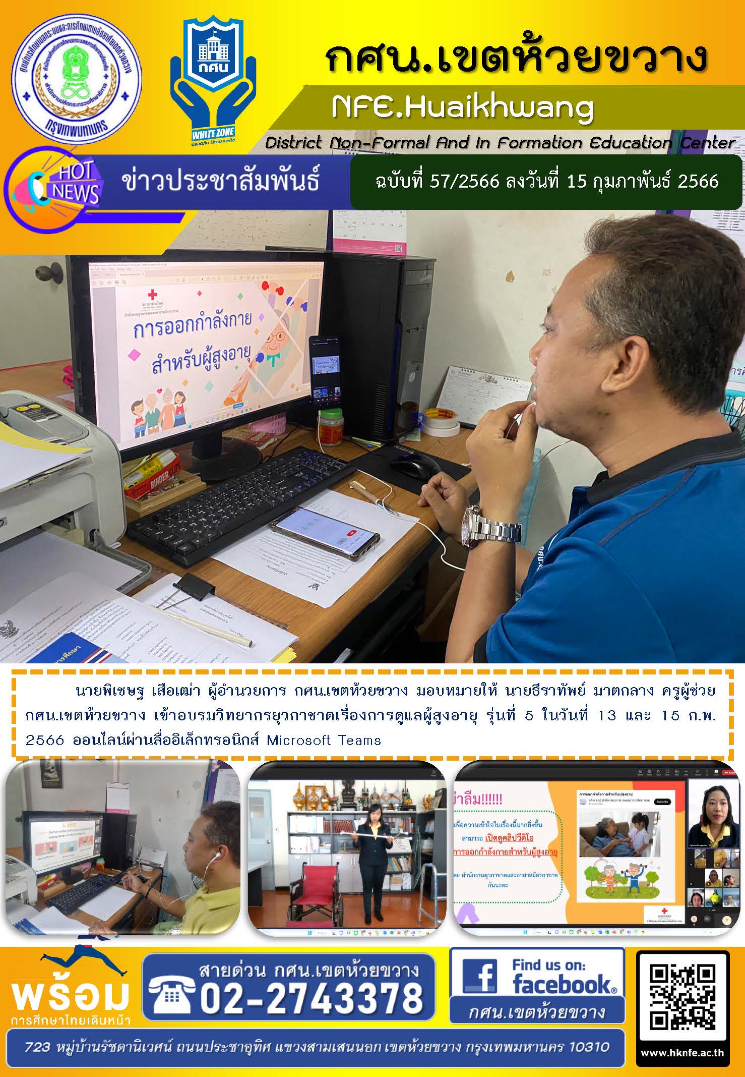 นายพิเชษฐ เสือเฒ่า ผู้อำนวยการ กศน.เขตห้วยขวาง มอบหมายให้ นายธีราทัพย์ มาตกลาง ครูผู้ช่วย กศน.เขตห้วยขวาง เข้าอบรมวิทยากรยุวกาชาดเรื่องการดูแลผู้สูงอายุ รุ่นที่ 5 ในวันที่ 13 และ 15 ก.พ. 2566 ออนไลน์ผ่านลื่ออิเล็กทรอนิกส์ Microsoft Teams