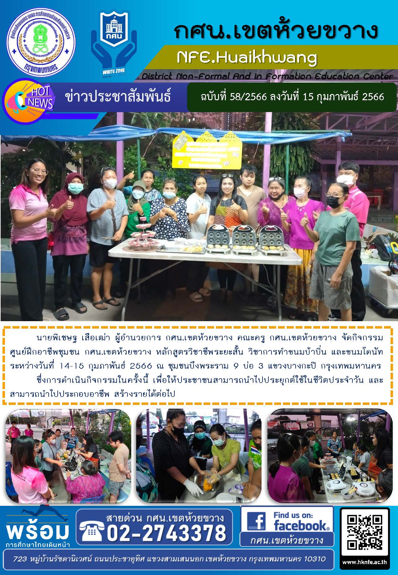 นายพิเชษฐ เสือเฒ่า ผู้อำนวยการ กศน.เขตห้วยขวาง คณะครู กศน.เขตห้วยขวาง จัดกิจกรรมศูนย์ฝึกอาชีพชุมชน กศน.เขตห้วยขวาง หลักสูตรวิชาชีพระยะสั้น วิชาการทำขนมบ้าบิ่น และขนมโดนัท ระหว่างวันที่ 14-15 กุมภาพันธ์ 2566 ณ ชุมชนบึงพระราม 9 บ่อ 3 แขวงบางกะปิ กรุงเทพมหานคร