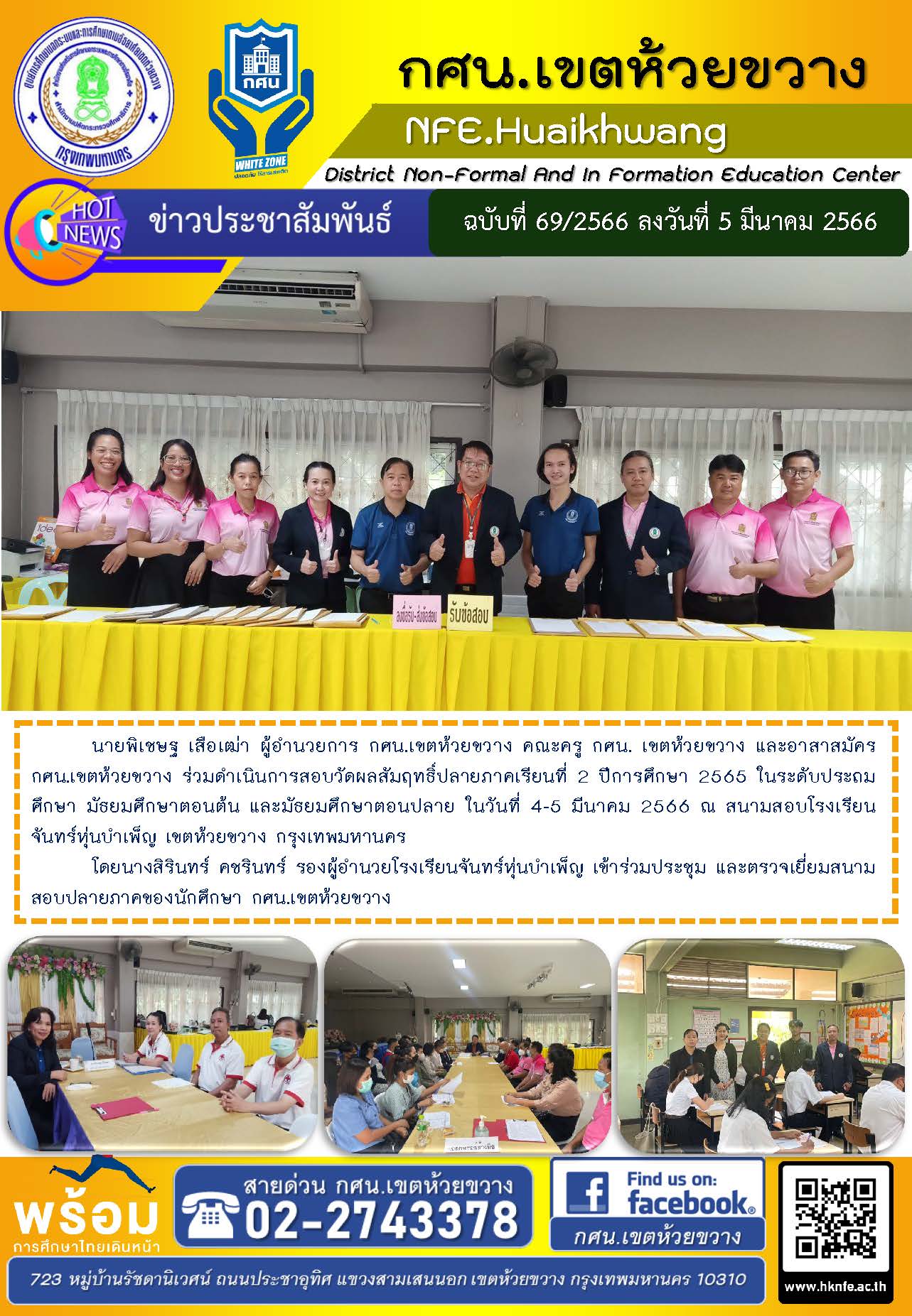 นายพิเชษฐ เสือเฒ่า ผู้อำนวยการ กศน.เขตห้วยขวาง คณะครู กศน. เขตห้วยขวาง และอาสาสมัคร กศน.เขตห้วยขวาง ร่วมดำเนินการสอบวัดผลสัมฤทธิ์ปลายภาคเรียนที่ 2 ปีการศึกษา 2565 ในระดับประถมศึกษา มัธยมศึกษาตอนต้น และมัธยมศึกษาตอนปลาย ในวันที่ 4-5 มีนาคม 2566 ณ สนามสอบโรงเรียนจันทร์หุ่นบำเพ็ญ เขตห้วยขวาง กรุงเทพมหานคร