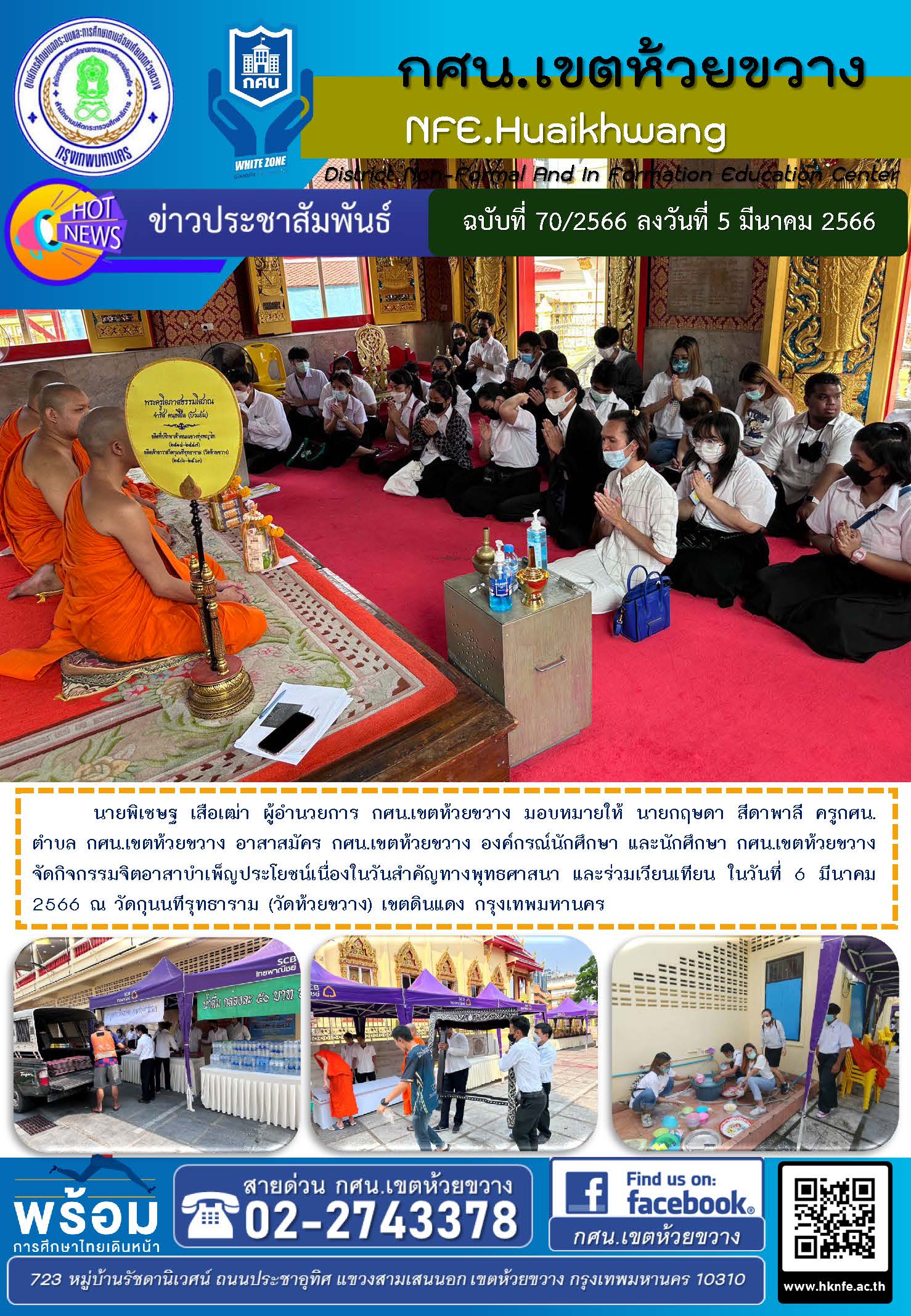 นายพิเชษฐ เสือเฒ่า ผู้อำนวยการ กศน.เขตห้วยขวาง มอบหมายให้ นายกฤษดา สีดาพาลี ครูกศน.ตำบล กศน.เขตห้วยขวาง อาสาสมัคร กศน.เขตห้วยขวาง องค์กรณ์นักศึกษา และนักศึกษา กศน.เขตห้วยขวาง จัดกิจกรรมจิตอาสาบำเพ็ญประโยชน์เนื่องในวันสำคัญทางพุทธศาสนา และร่วมเวียนเทียน ในวันที่ 6 มีนาคม 2566 ณ วัดกุนนทีรุทธาราม (วัดห้วยขวาง) เขตดินแดง กรุงเทพมหานคร