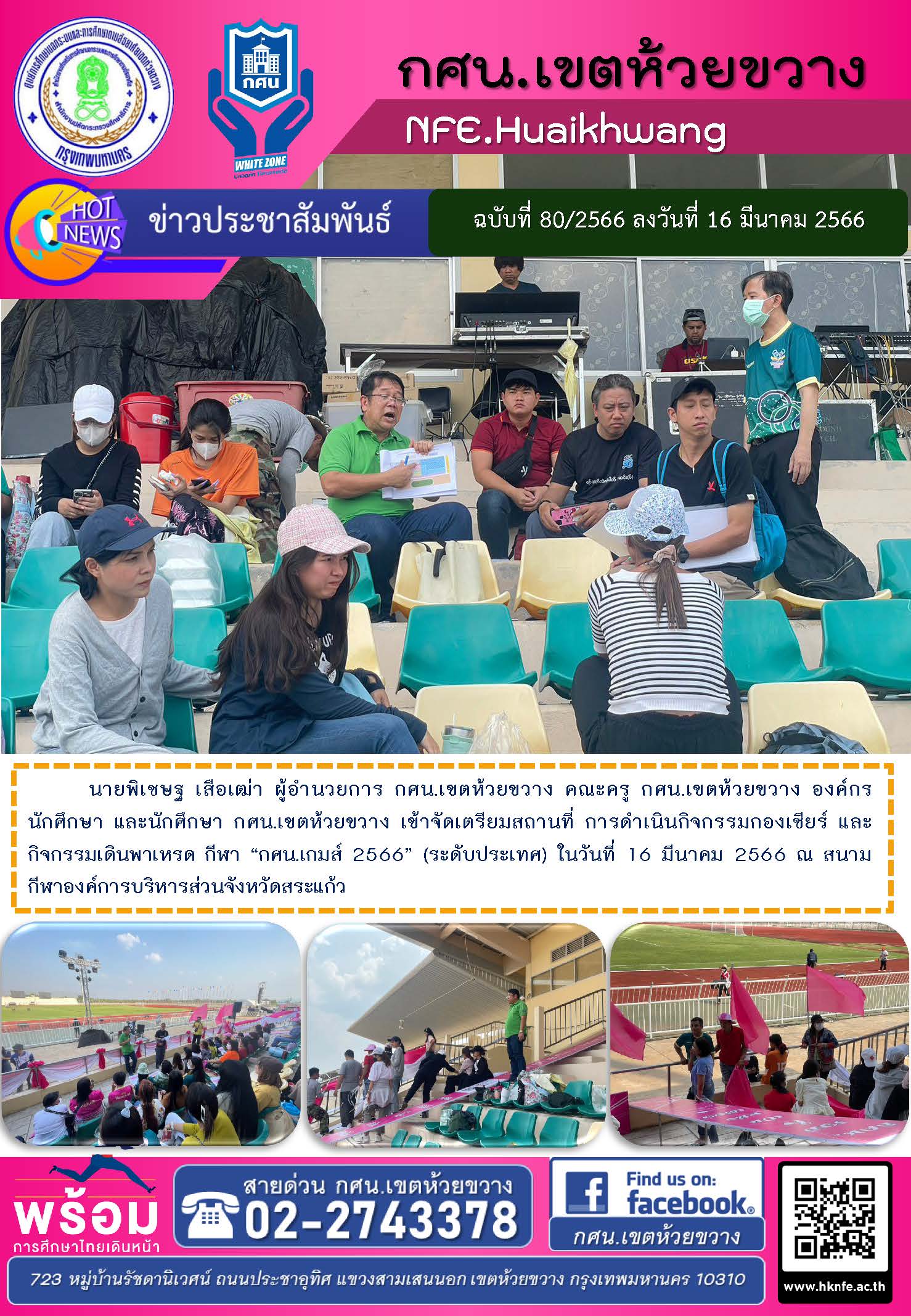 นายพิเชษฐ เสือเฒ่า ผู้อำนวยการ กศน.เขตห้วยขวาง คณะครู กศน.เขตห้วยขวาง องค์กรนักศึกษา และนักศึกษา กศน.เขตห้วยขวาง เข้าจัดเตรียมสถานที่ การดำเนินกิจกรรมกองเชียร์ และกิจกรรมเดินพาเหรด กีฬา “กศน.เกมส์ 2566” (ระดับประเทศ) ในวันที่ 16 มีนาคม 2566 ณ สนามกีฬาองค์การบริหารส่วนจังหวัดสระแก้ว