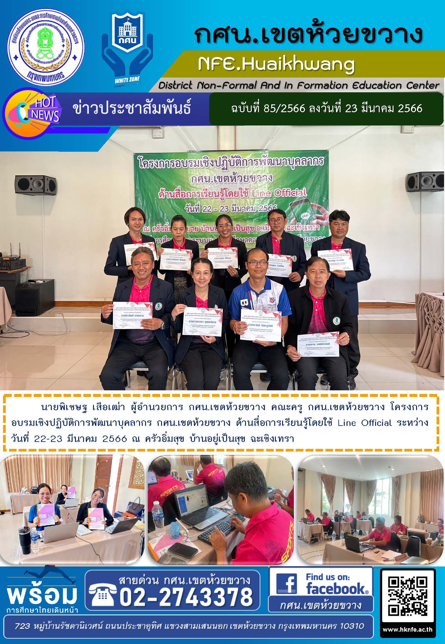 นายพิเชษฐ เสือเฒ่า ผู้อำนวยการ กศน.เขตห้วยขวาง คณะครู กศน.เขตห้วยขวาง โครงการอบรมเชิงปฏิบัติการพัฒนาบุคลากร กศน.เขตห้วยขวาง ด้านสื่อการเรียนรู้โดยใช้ Line Official ระหว่างวันที่ 22-23 มีนาคม 2566 ณ ครัวอิ่มสุข บ้านอยู่เป็นสุข ฉะเชิงเทรา