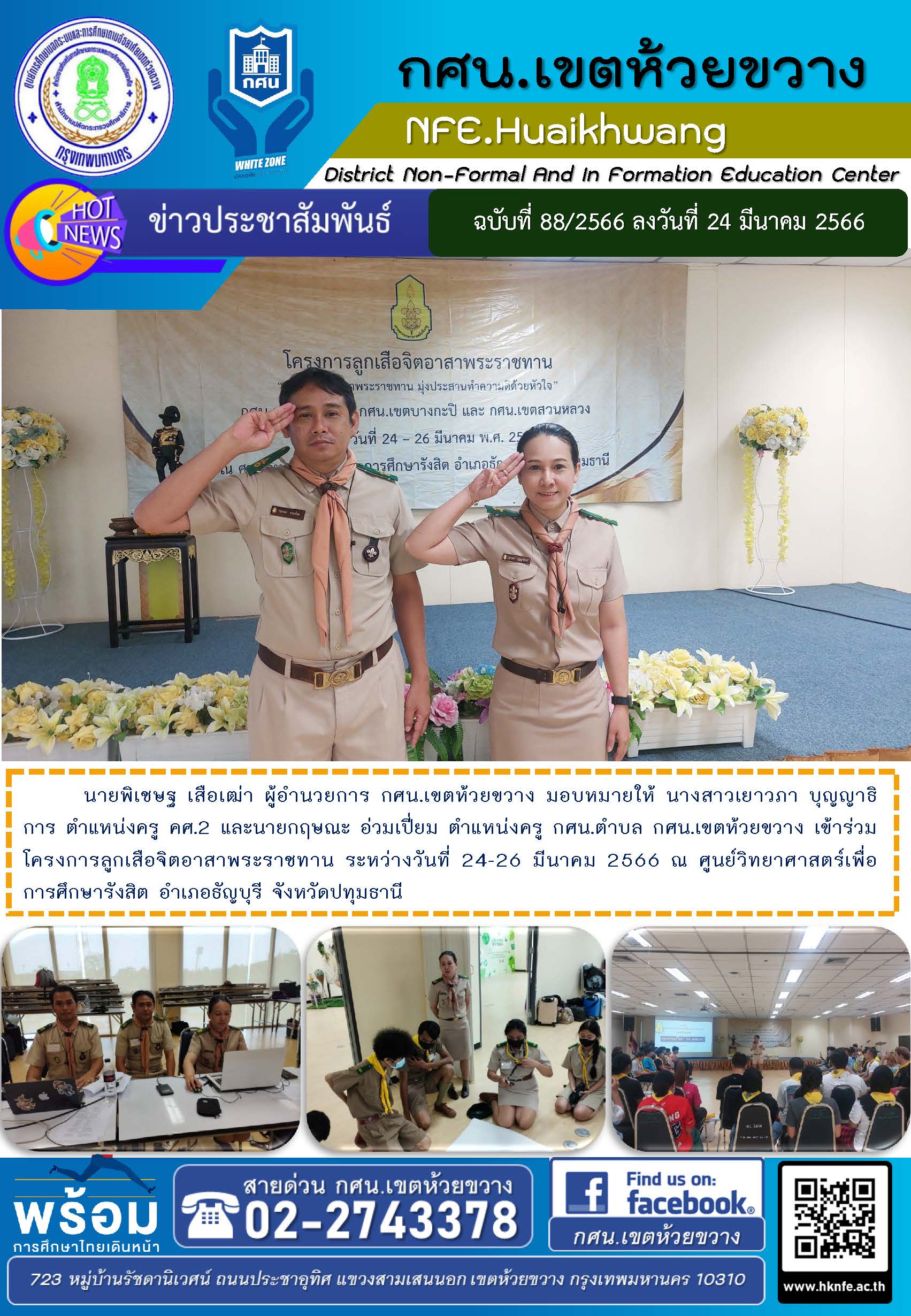 นายพิเชษฐ เสือเฒ่า ผู้อำนวยการ กศน.เขตห้วยขวาง มอบหมายให้ นางสาวเยาวภา บุญญาธิการ ตำแหน่งครู คศ.2 และนายกฤษณะ อ่วมเปี่ยม ตำแหน่งครู กศน.ตำบล กศน.เขตห้วยขวาง เข้าร่วมโครงการลูกเสือจิตอาสาพระราชทาน ระหว่างวันที่ 24-26 มีนาคม 2566 ณ ศูนย์วิทยาศาสตร์เพื่อการศึกษารังสิต อำเภอธัญบุรี จังหวัดปทุมธานี