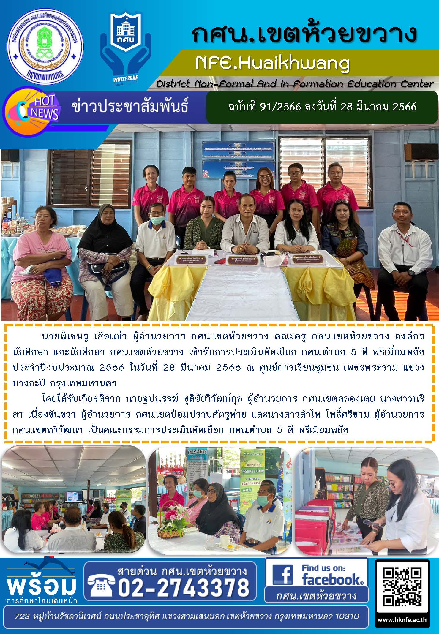 นายพิเชษฐ เสือเฒ่า ผู้อำนวยการ กศน.เขตห้วยขวาง คณะครู กศน.เขตห้วยขวาง องค์กรนักศึกษา และนักศึกษา กศน.เขตห้วยขวาง เข้ารับการประเมินคัดเลือก กศน.ตำบล 5 ดี พรีเมี่ยมพลัส ประจำปีงบประมาณ 2566 ในวันที่ 28 มีนาคม 2566 ณ ศูนย์การเรียนชุมชน เพชรพระราม แขวงบางกะปิ กรุงเทพมหานคร
