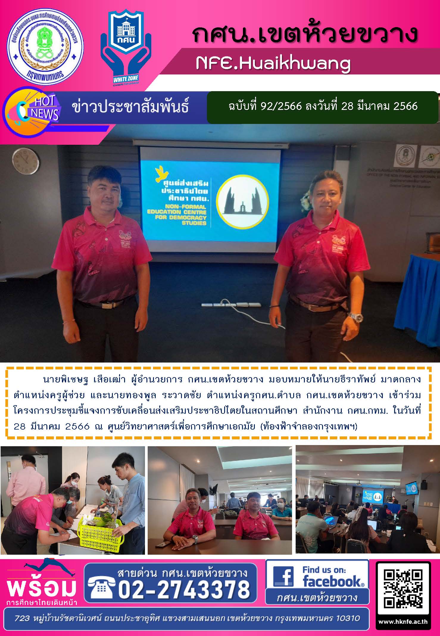 นายพิเชษฐ เสือเฒ่า ผู้อำนวยการ กศน.เขตห้วยขวาง มอบหมายให้นายธีราทัพย์ มาตกลาง ตำแหน่งครูผู้ช่วย และนายทองพูล ระวาดชัย ตำแหน่งครูกศน.ตำบล กศน.เขตห้วยขวาง เข้าร่วมโครงการประชุมชี้แจงการขับเคลื่อนส่งเสริมประชาธิปไตยในสถานศึกษา สำนักงาน กศน.กทม. ในวันที่ 28 มีนาคม 2566 ณ ศูนย์วิทยาศาสตร์เพื่อการศึกษาเอกมัย (ท้องฟ้าจำลองกรุงเทพฯ)