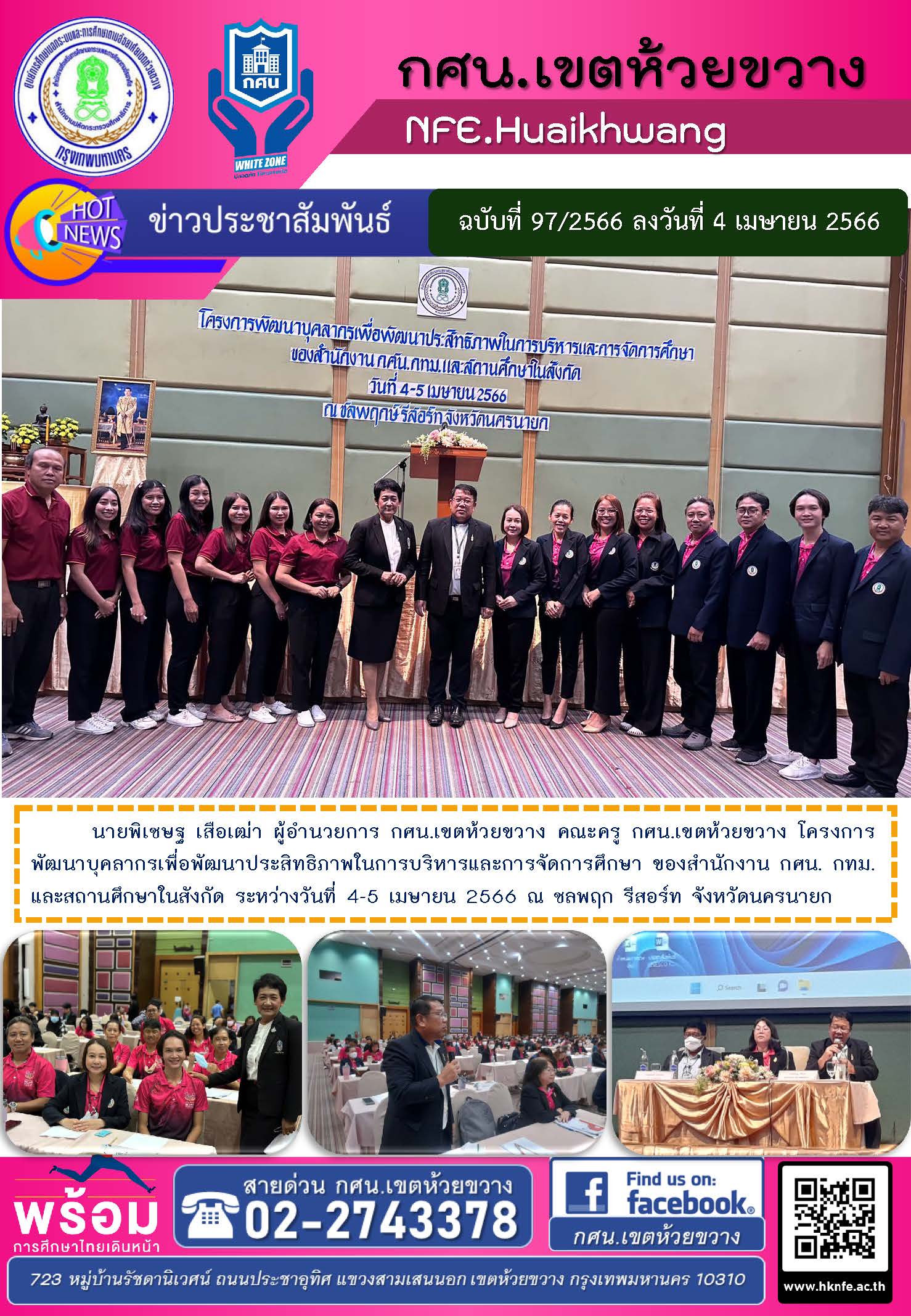 นายพิเชษฐ เสือเฒ่า ผู้อำนวยการ กศน.เขตห้วยขวาง คณะครู กศน.เขตห้วยขวาง โครงการพัฒนาบุคลากรเพื่อพัฒนาประสิทธิภาพในการบริหารและการจัดการศึกษา ของสำนักงาน กศน. กทม. และสถานศึกษาในสังกัด ระหว่างวันที่ 4-5 เมษายน 2566 ณ ชลพฤกษ์ รีสอร์ท จังหวัดนครนายก