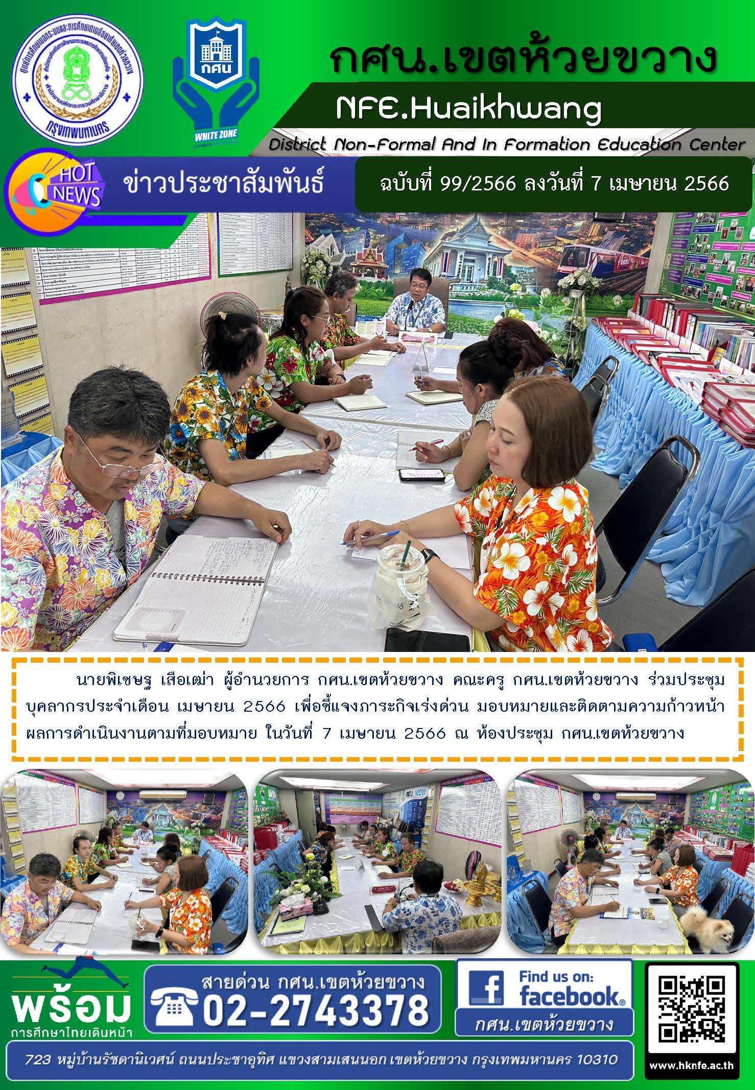 นายพิเชษฐ เสือเฒ่า ผู้อำนวยการ กศน.เขตห้วยขวาง คณะครู กศน.เขตห้วยขวาง ร่วมประชุมบุคลากรประจำเดือน เมษายน 2566 เพื่อชี้แจงภาระกิจเร่งด่วน มอบหมายและติดตามความก้าวหน้าผลการดำเนินงานตามที่มอบหมาย ในวันที่ 7 เมษายน 2566 ณ ห้องประชุม กศน.เขตห้วยขวาง