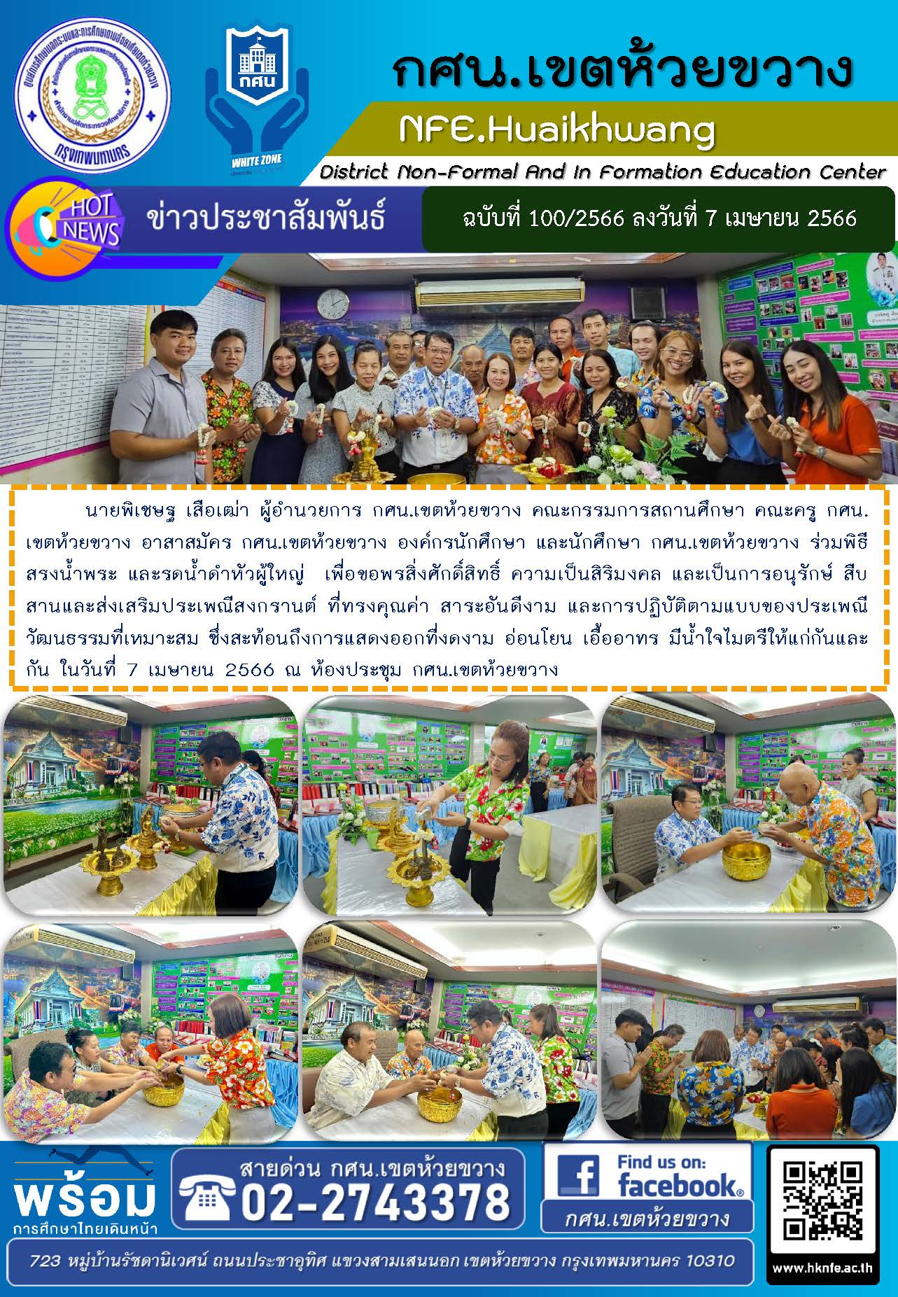 นายพิเชษฐ เสือเฒ่า ผู้อำนวยการ กศน.เขตห้วยขวาง คณะกรรมการสถานศึกษา คณะครู กศน.เขตห้วยขวาง อาสาสมัคร กศน.เขตห้วยขวาง องค์กรนักศึกษา และนักศึกษา กศน.เขตห้วยขวาง ร่วมพิธีสรงน้ำพระ และรดน้ำดำหัวผู้ใหญ่ เพื่อขอพรสิ่งศักดิ์สิทธิ์ ความเป็นสิริมงคล และเป็นการอนุรักษ์ สืบสานและส่งเสริมประเพณีสงกรานต์ ที่ทรงคุณค่า สาระอันดีงาม และการปฏิบัติตามแบบของประเพณีวัฒนธรรมที่เหมาะสม ซึ่งสะท้อนถึงการแสดงออกที่งดงาม อ่อนโยน เอื้ออาทร มีน้ำใจไมตรีให้แก่กันและกัน ในวันที่ 7 เมษายน 2566 ณ ห้องประชุม กศน.เขตห้วยขวาง